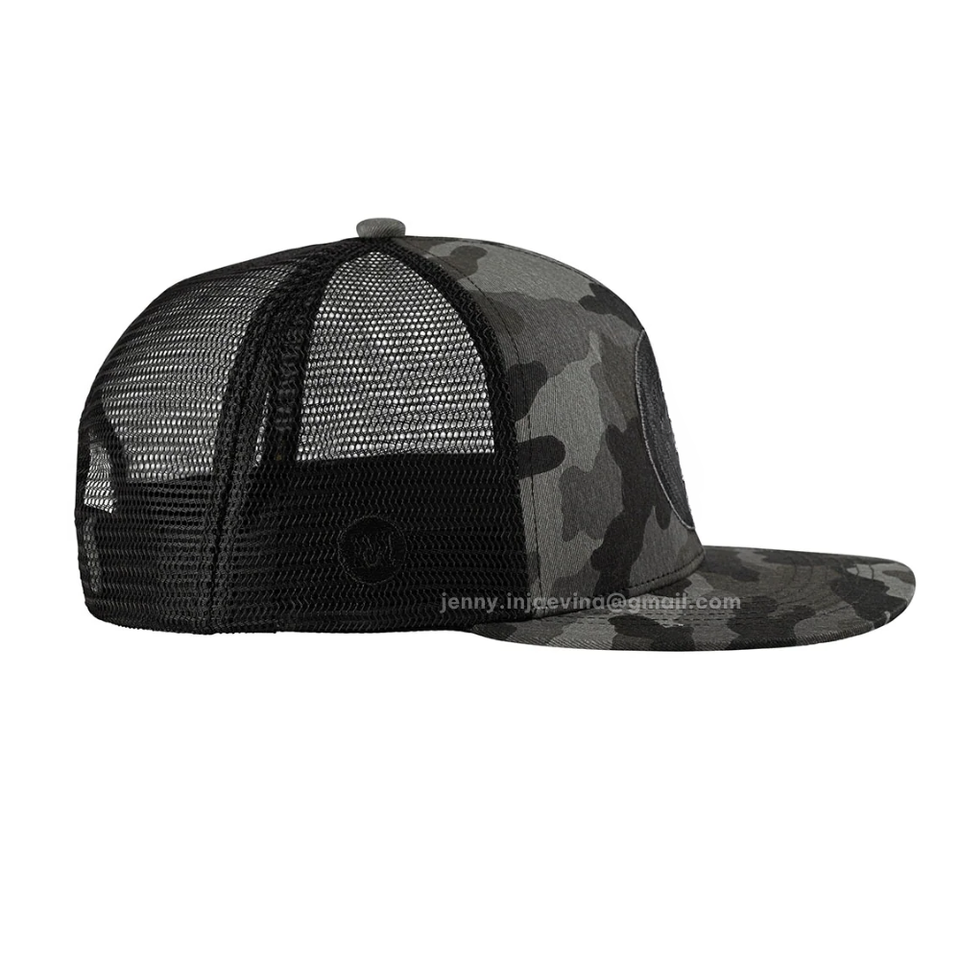 หมวกโครงสร้างลายพรางตาข่ายคอตตอนระบายอากาศได้ดีหมวกทรกเกอร์ลายพรางออกแบบได้ตามต้องการโลโก้ตามต้องการ
