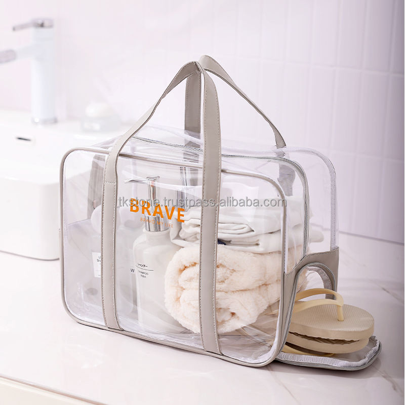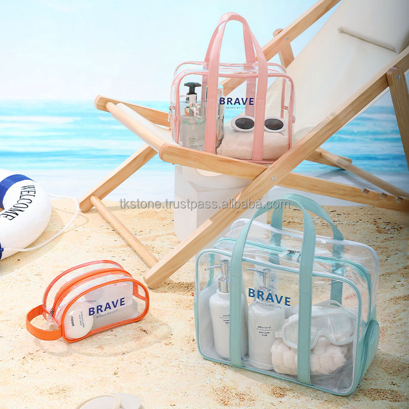 กระเป๋าเครื่องสำอางแบบพกพาแฟชั่นแบบใสของผู้หญิงกระเป๋าเก็บซิปพีวีซีล้างทำความสะอาดได้พร้อมฟังก์ชั่นว่ายน้ำชายหาด