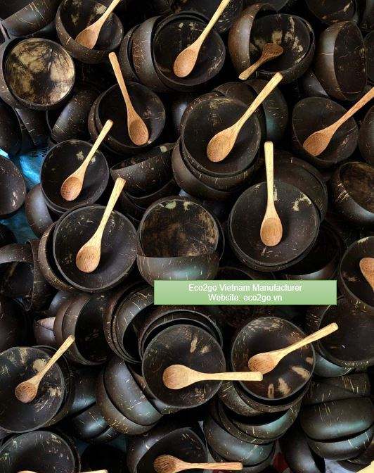 ชามกะลามะพร้าวพร้อมช้อนชุดกะลามะพร้าวใช้งานฝีมือเป็นมิตรต่อสิ่งแวดล้อมทำจากเวียดนาม