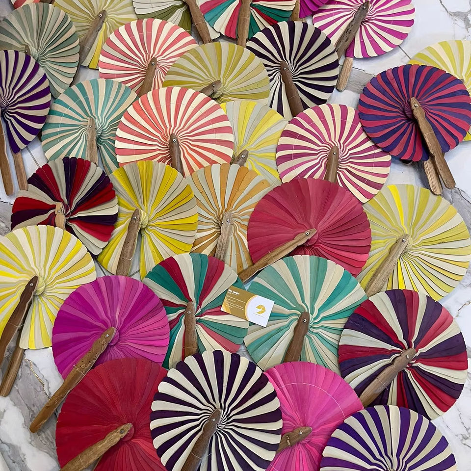 พัดลมใบปาล์มแบบทำมือสไตล์เวียดนามสำหรับตกแต่งแบบดั้งเดิมจำนวนมาก