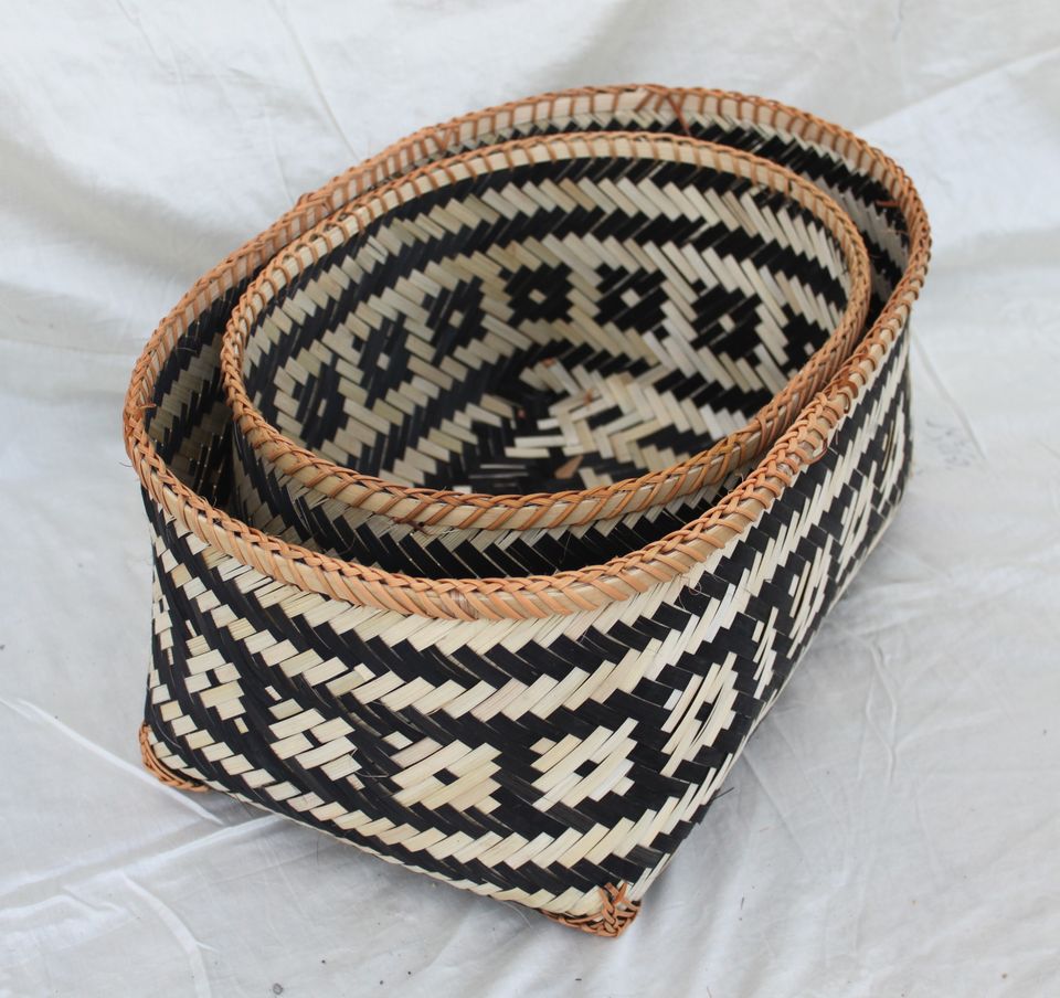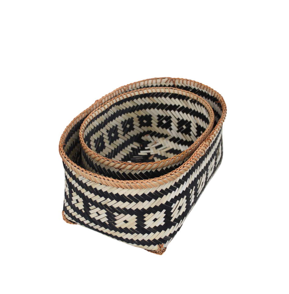 ตะกร้าไม้ไผ่สานมือสไตล์เวียดนามพร้อมลวดลายชนเผ่าสีดำและธรรมชาติตกแต่งบ้านทรงรีมีสไตล์