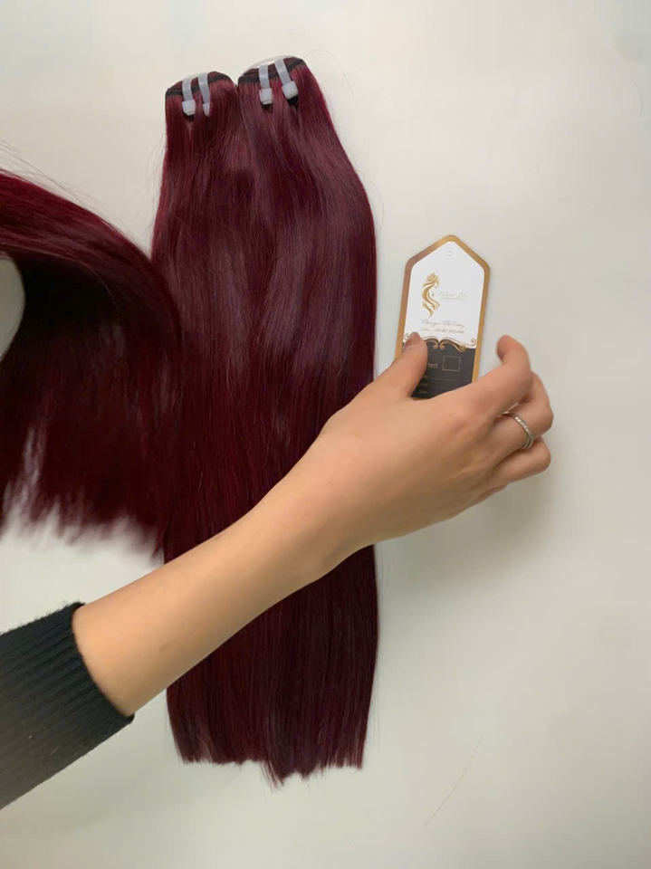 เทปต่อผมมนุษย์แบบเวียดนามสีแดงตรงติดหนังกำพร้าจัดแนวเส้นผมสองเส้นเรียบทนทาน