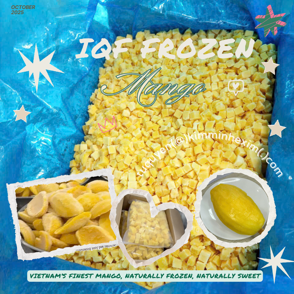 มะม่วงแช่แข็ง IQF จากเวียดนาม แบบหั่นครึ่ง คุณภาพสูง บรรจุภัณฑ์สุญญากาศ สำหรับ HORECA และโรงงานผลิต เก็บรักษาที่อุณหภูมิ -18 องศาเซลเซียส