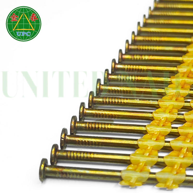ตะปูพลาสติกแบบแถบ 21 องศา ผลิตในเวียดนาม ชนิดหัววงแหวน/หัวสกรู/หัวเรียบ เคลือบสีเหลือง สำหรับปืนยิงตะปู ใช้สำหรับงานโครงสร้างและก่อสร้าง