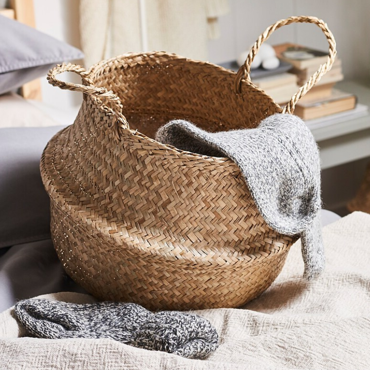 ตะกร้าสานจากหญ้าทะเลแบบสั่งทำได้ ขนาดตามต้องการ ผลิตในเวียดนาม เป็นมิตรกับสิ่งแวดล้อม พร้อมหูจับจากเส้นใยธรรมชาติ ใช้ได้หลากหลาย สำหรับเก็บของ งานฝีมือ
