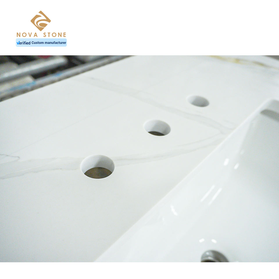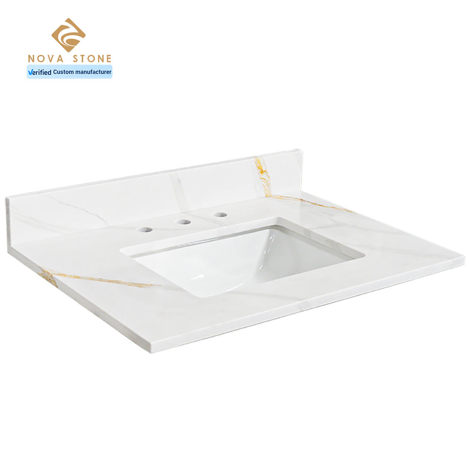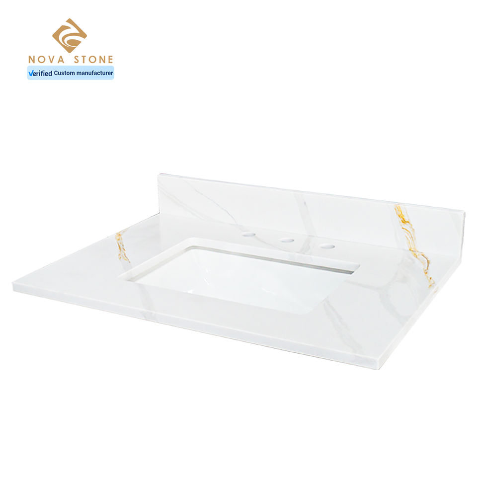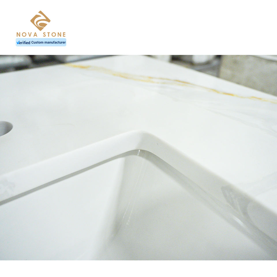 Calacatta หินควอตซ์เทียมสีทองกันน้ำสำเร็จรูปใช้ในห้องน้ำโต๊ะทำงานในห้องน้ำการผลิตในเวียดนาม