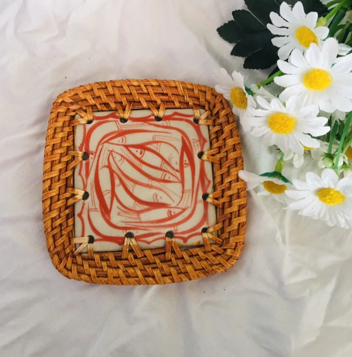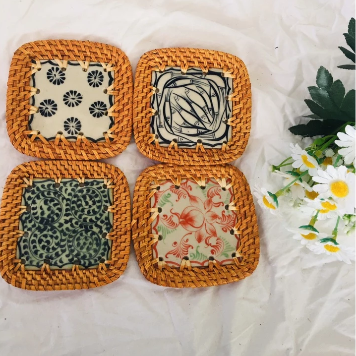 ที่รองแก้วเครื่องดื่มหวายทรงสี่เหลี่ยมทำจากเซรามิกสำหรับบ้านหรือคาเฟ่ในเวียดนาม