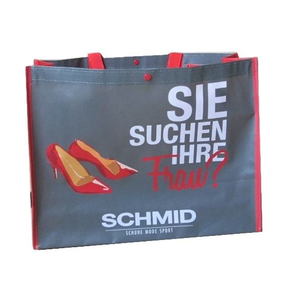 กระเป๋าช้อปปิ้งลายตัวอักษรแบบพับได้ทันสมัยเป็นมิตรกับสิ่งแวดล้อมจากเวียดนาม ผลิตจากวัสดุ PP ทอ และ RPET ไม่ทอ ยี่ห้อ KIM DUC