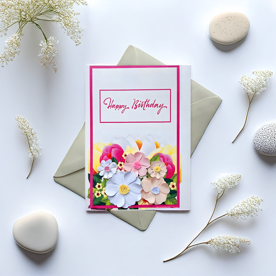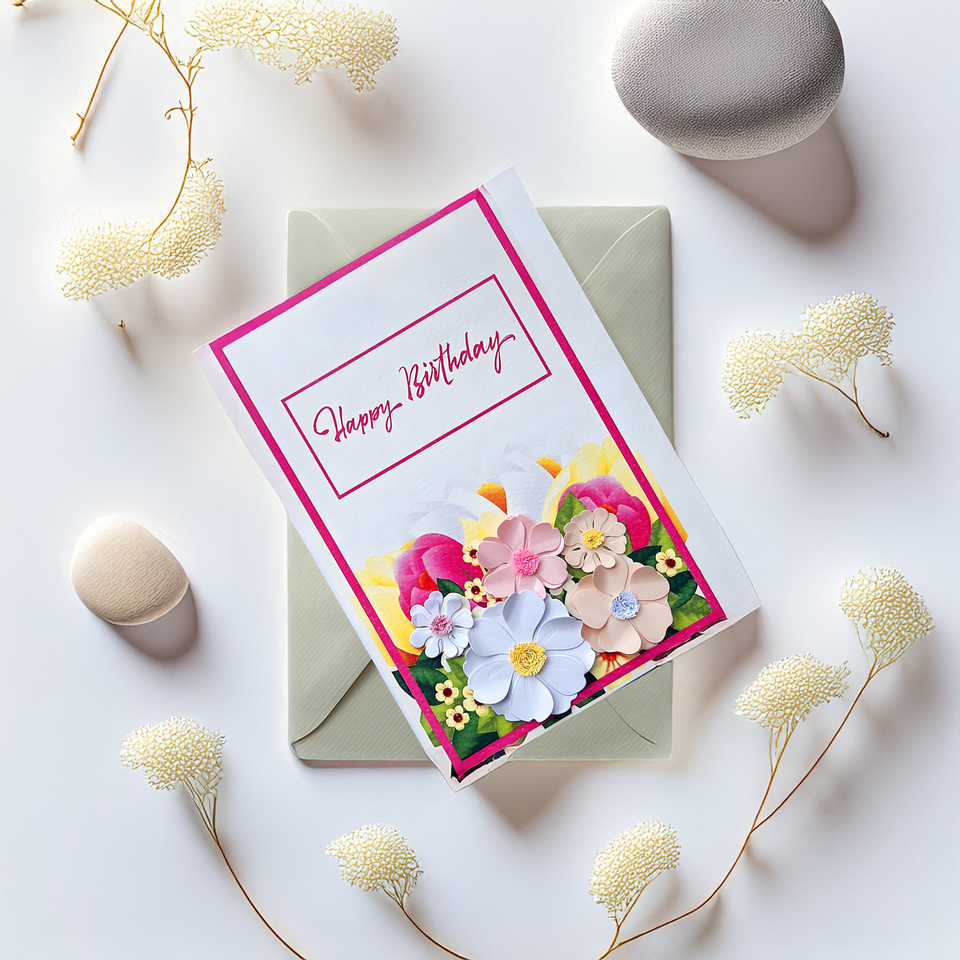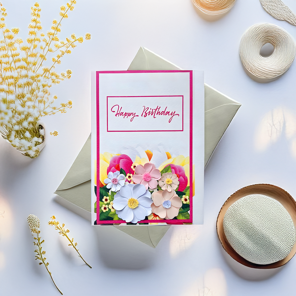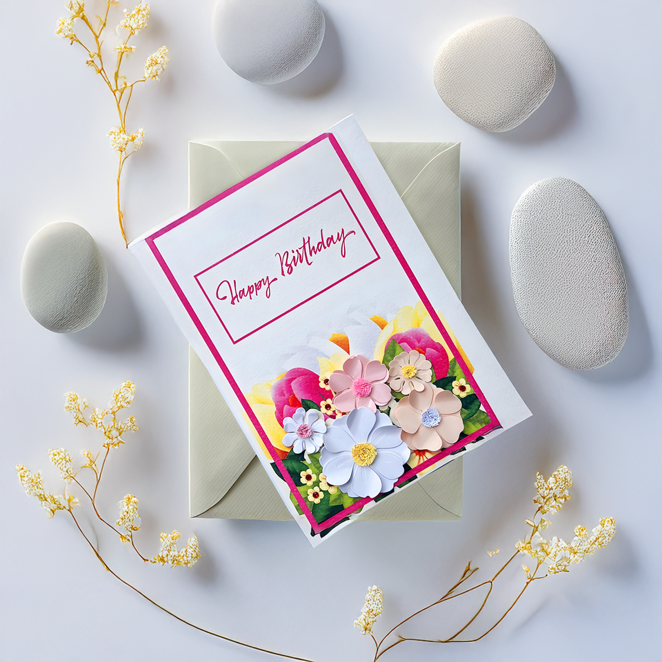 กระดาษเวียดนามเป็นมิตรกับสิ่งแวดล้อมการ์ดอวยพรทรงสี่เหลี่ยมออกแบบได้เองสุขสันต์วันเกิดการ์ดม้วนลายดอกไม้ปั๊มทองหลายชั้น