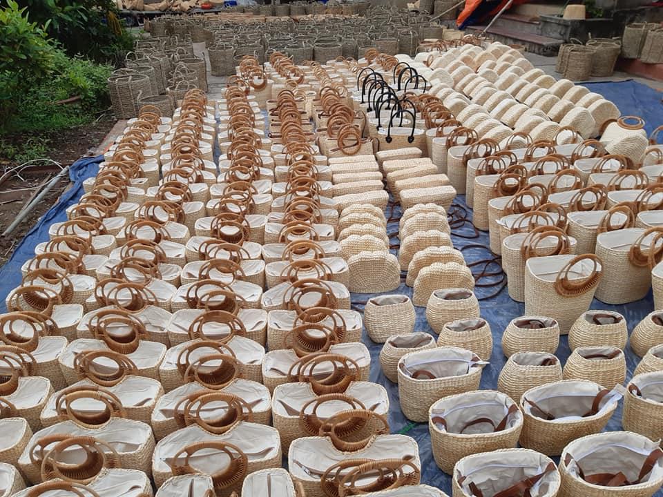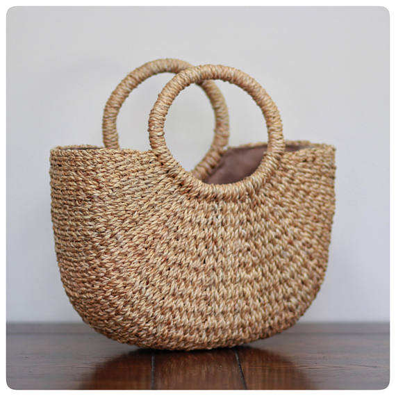 กระเป๋าถือสานหญ้าทะเลธรรมชาติทำมือแบบเป็นมิตรต่อสิ่งแวดล้อมสำหรับผู้หญิง แฟชั่นคลาสสิกจากเวียดนาม บุด้วยผ้าฝ้ายลายเพชร พร้อมสายสะพาย