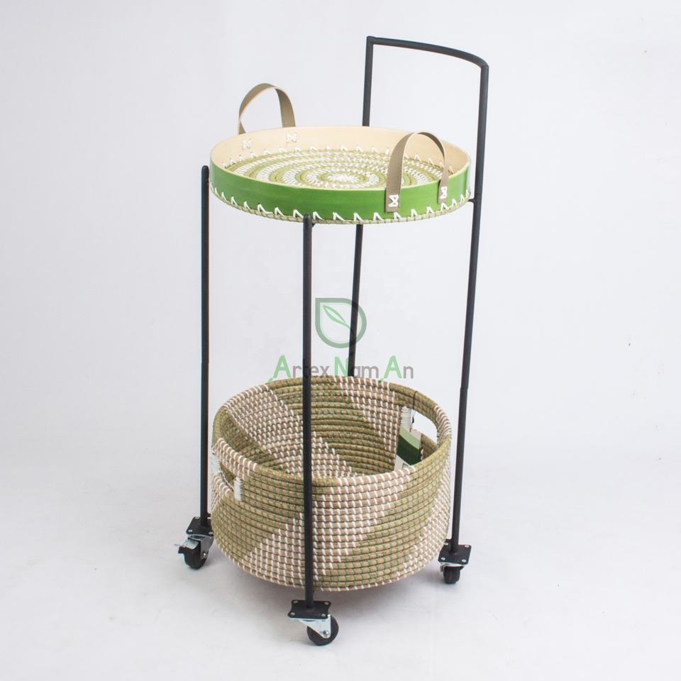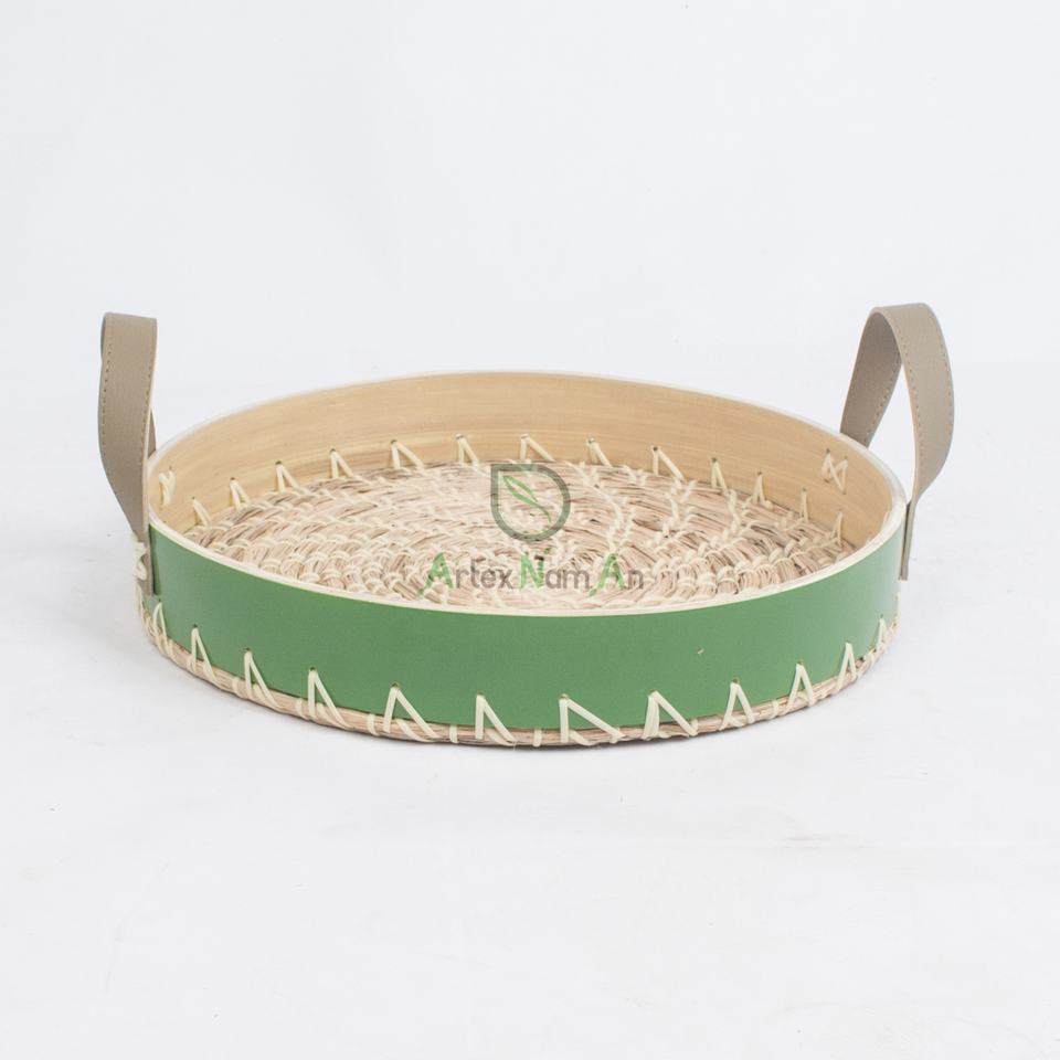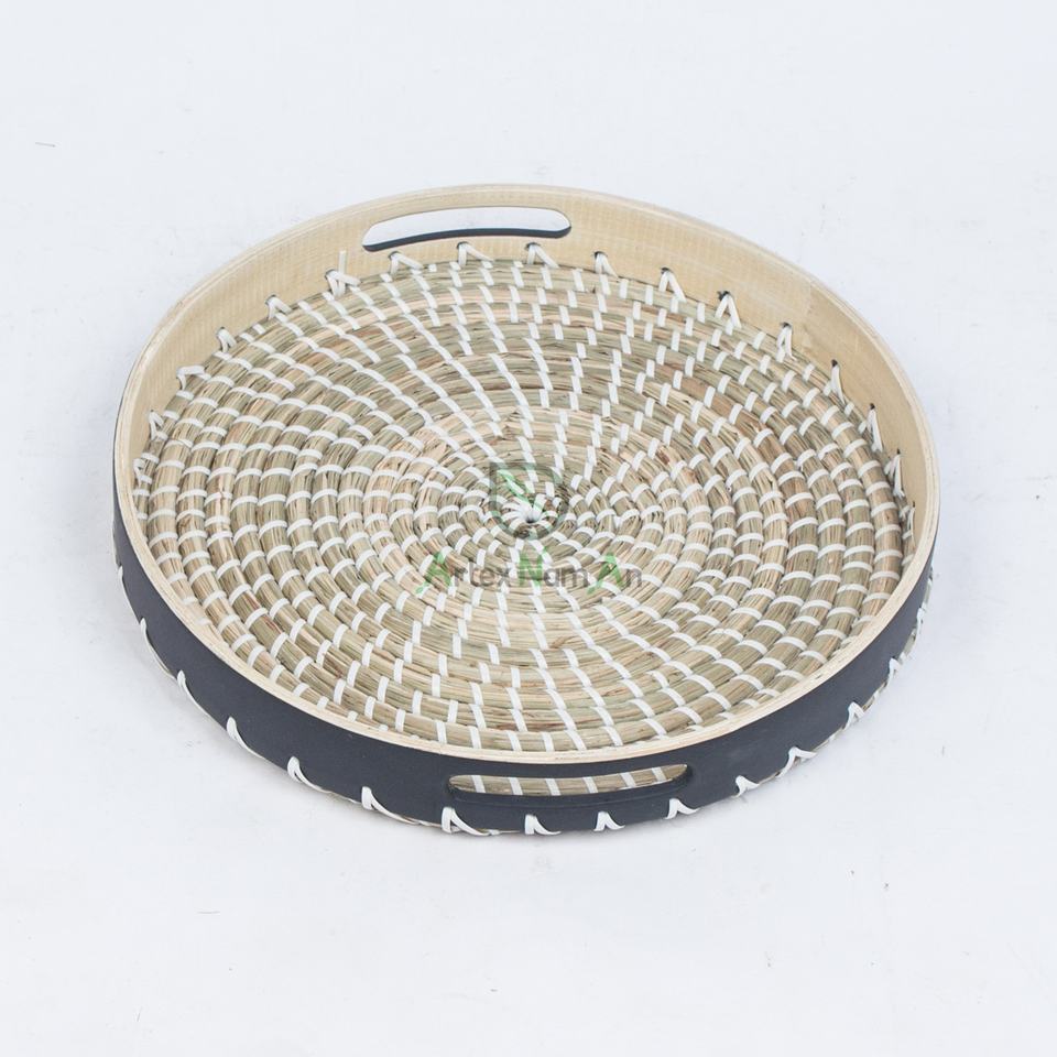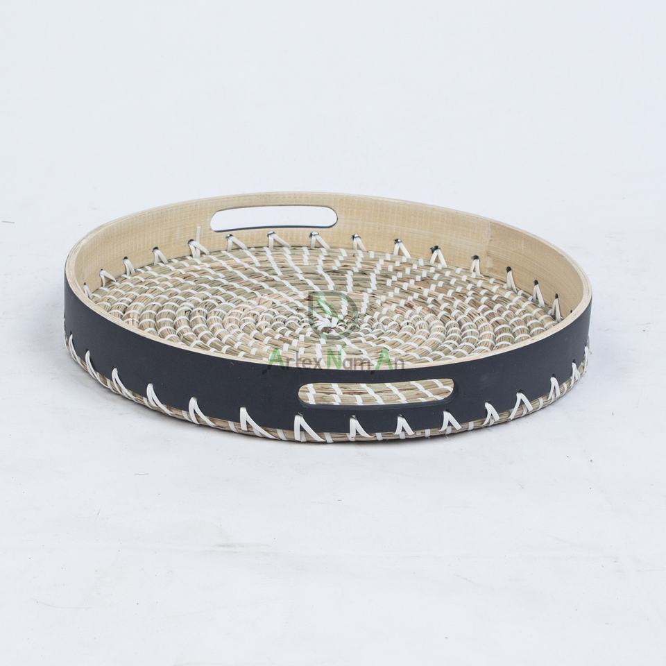 ถาดเสิร์ฟชาและกาแฟทรงกลมทำจากไม้ไผ่และหญ้าทะเลสำหรับตกแต่งห้องครัวและตกแต่งบ้าน