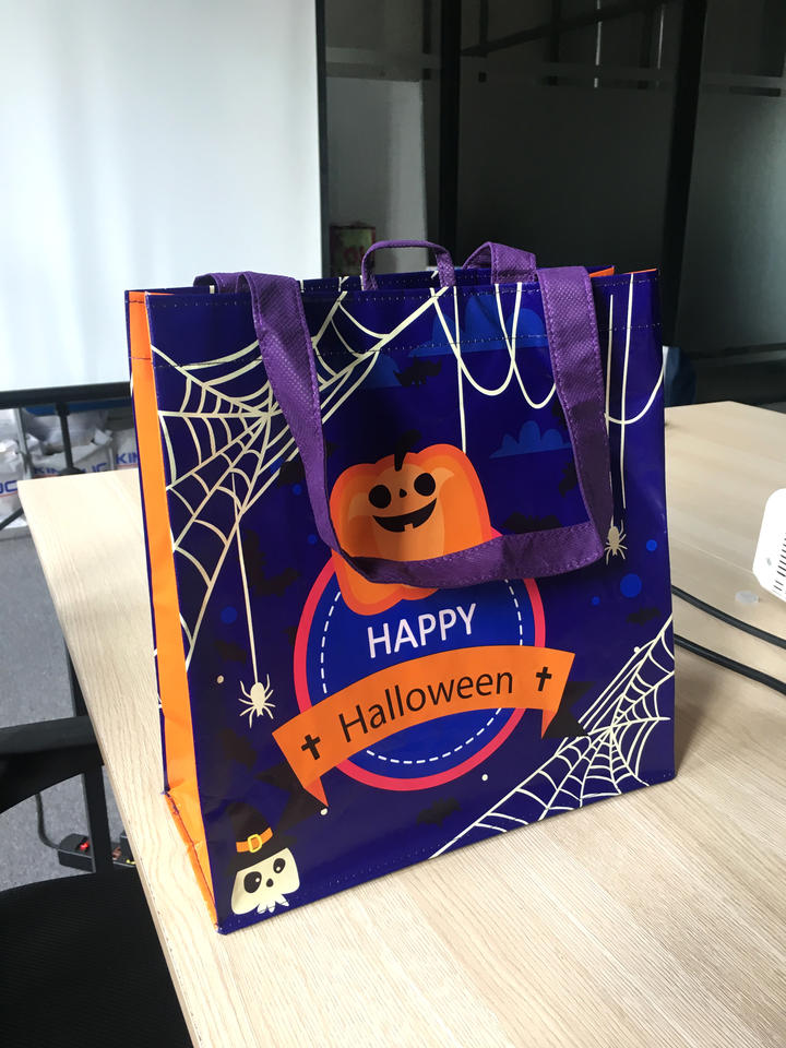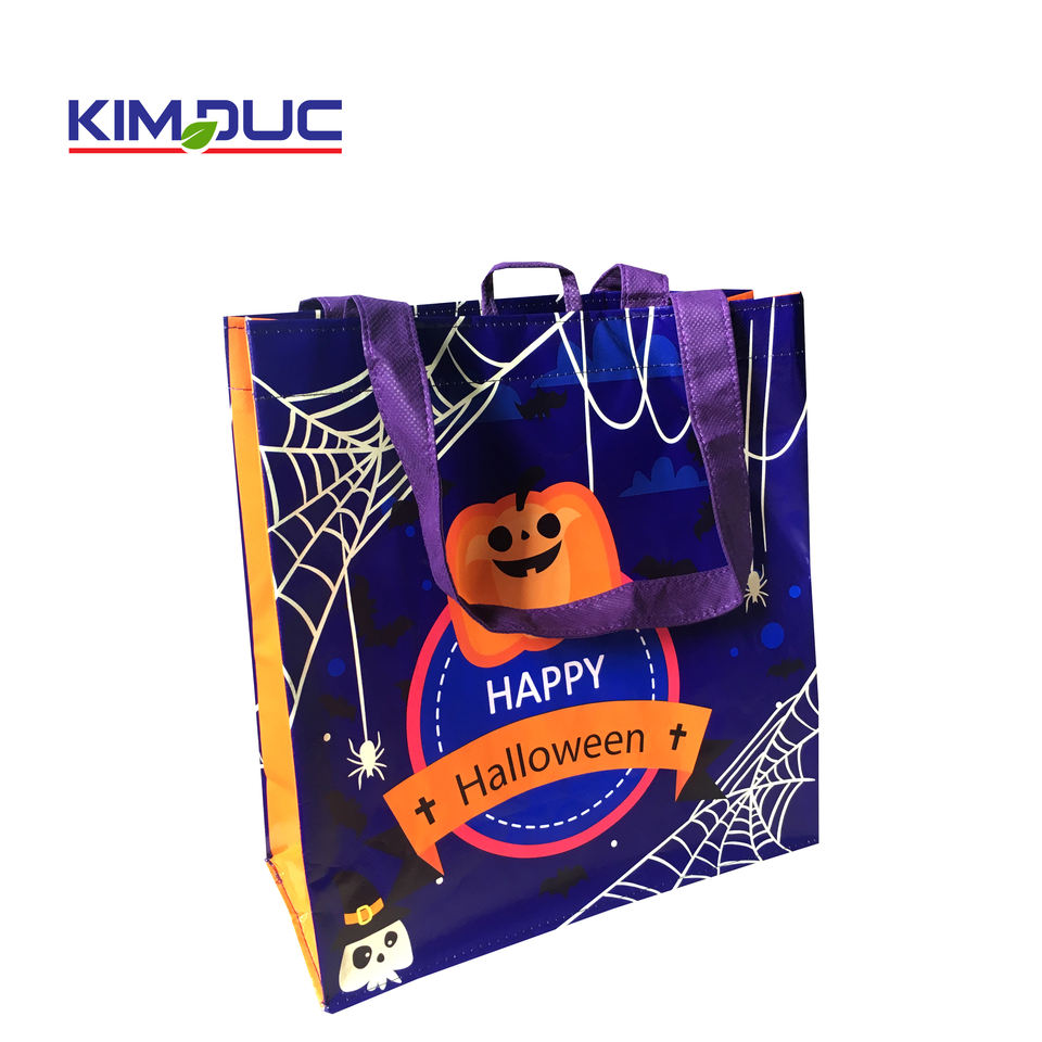 ถุงผ้าไม่ทอแบบใช้ซ้ำได้สำหรับวันฮาโลวีน เป็นมิตรกับสิ่งแวดล้อม สีตามสั่ง 120 GSM หูหิ้วยาว ใช้ซ้ำได้ สำหรับเด็กและอุตสาหกรรม