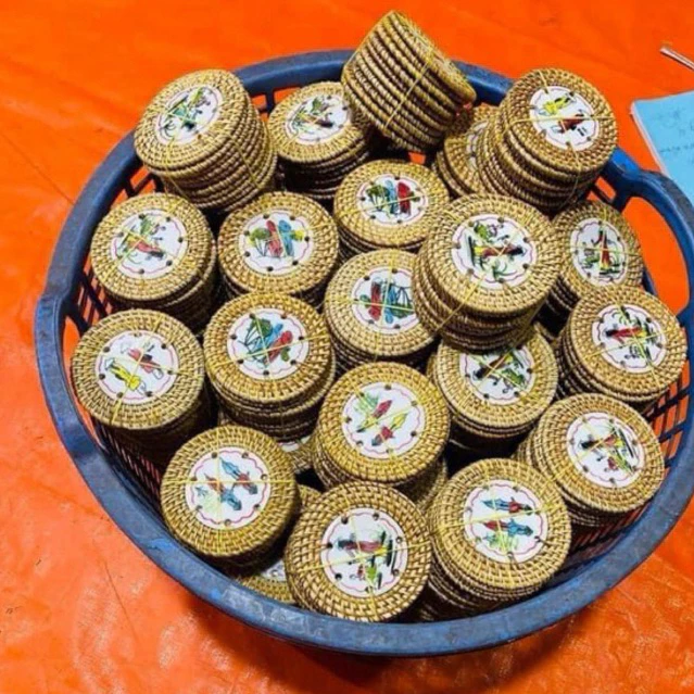 ที่รองแก้วหวายทอมือเวียดนามพร้อมลายครามฝัง-ทนทานและหรูหราสำหรับใช้ในชีวิตประจำวันหวายและเซรามิกแฮนด์เมด
