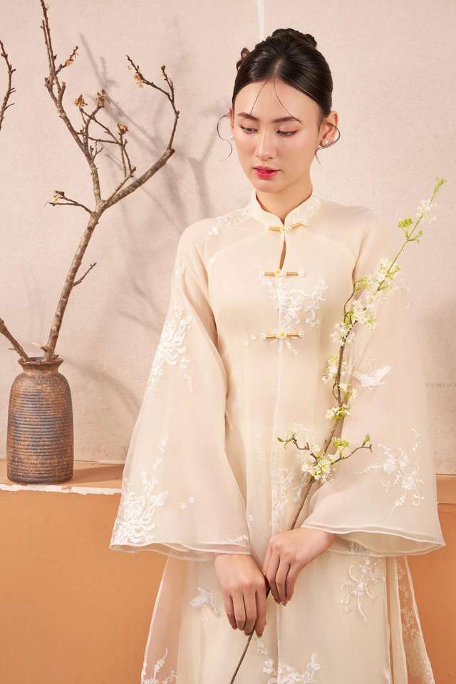 ชุดเดรสผ้าไหมอ่าวไดของผู้หญิงเวียดนามพร้อมลายปักดอกเบญจมาศ - เนื้อผ้านุ่มพลิ้วและสง่างาม KAD32
