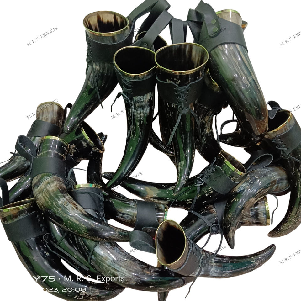 ฮอร์นดื่มควายไวกิ้ง500มล. แตรดื่มสำเร็จรูปธรรมชาติพร้อมขอบทองเหลืองและที่ยึดหนังฮอร์นที่ปลอดภัยสำหรับอาหารราคาจำนวนมาก