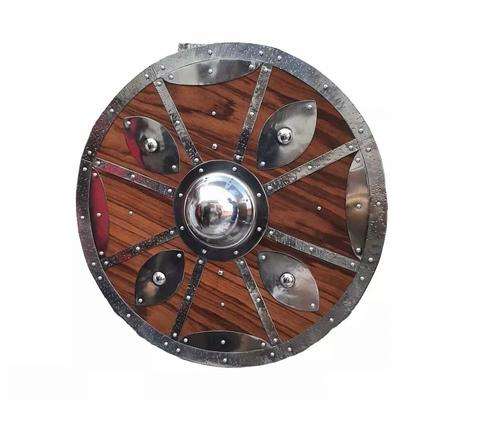 โล่ไวกิ้งที่มีรูปแบบวงกลมและรูนทำด้วยมือสำหรับการตกแต่งโรงละครนอร์สหรือนักรบ