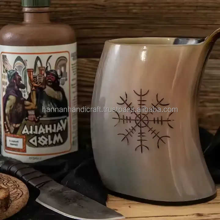 แก้วเบียร์สไตล์ไวกิ้งแก้วมักแบบใช้ซ้ำได้เป็นมิตรต่อสิ่งแวดล้อมพร้อมฝาเขาควายสไตล์สัตว์ขัดเงาสำหรับเบียร์น้ำงานฝีมือตามธรรมชาติ