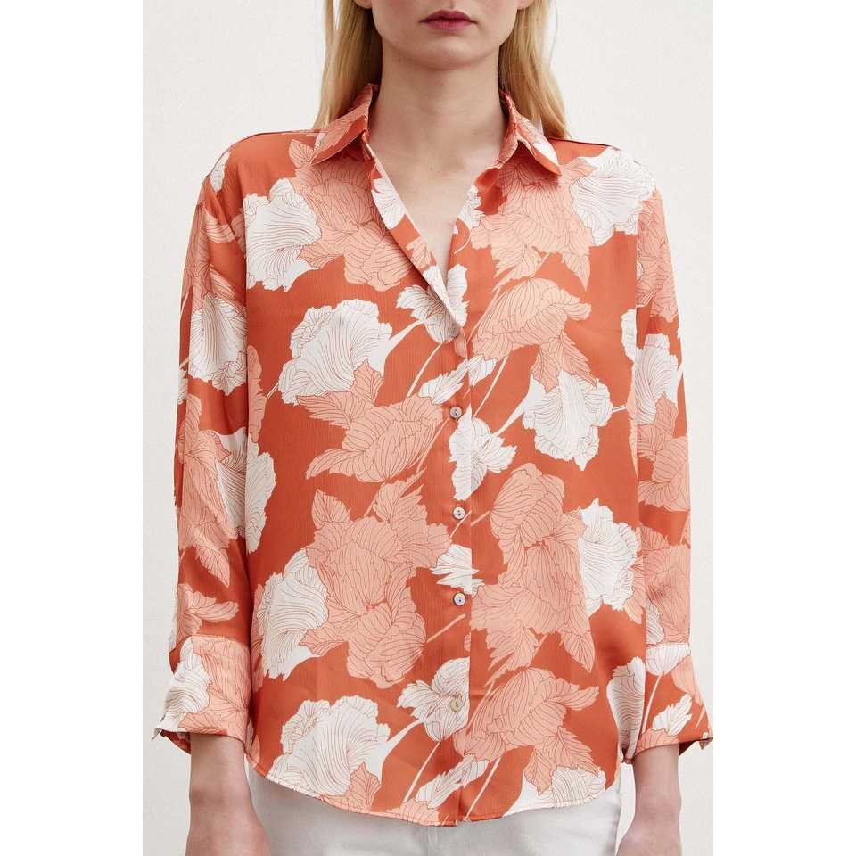 เสื้อเชิ้ตวิล่า ซาตินผู้หญิงลายดอกไม้สีเทอร์ราคอตต้าติดกระดุมเสื้อเชิ้ตลำลองสำหรับทุกวัน