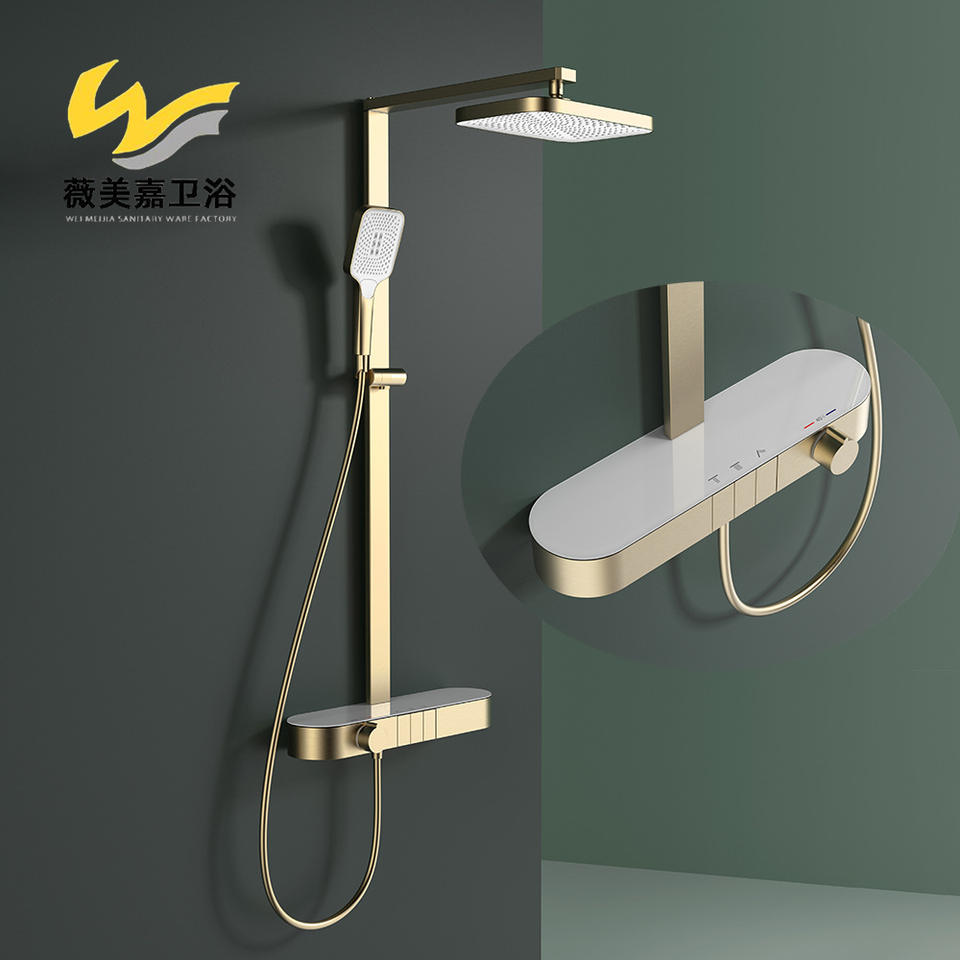 ก๊อกน้ำฝักบัวติดผนังแบบสามระดับ Vimijia รุ่นหรูหรา วงจรทองแดงทั้งหมด น้ำร้อนน้ำเย็น หัวฉีดแบบสเปรย์ด้านบน พร้อมชั้นวางของแบบแท่งสี่เหลี่ยมขนาดใหญ่