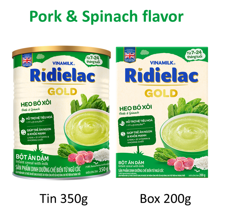 Vinamilk-ridielac Gold-ซีเรียลสำหรับเด็ก-เนื้อหมูและผักโขม-คุณภาพสูง-ขายส่ง-350กรัม X 24กระป๋อง GMP BRC ISO fssc