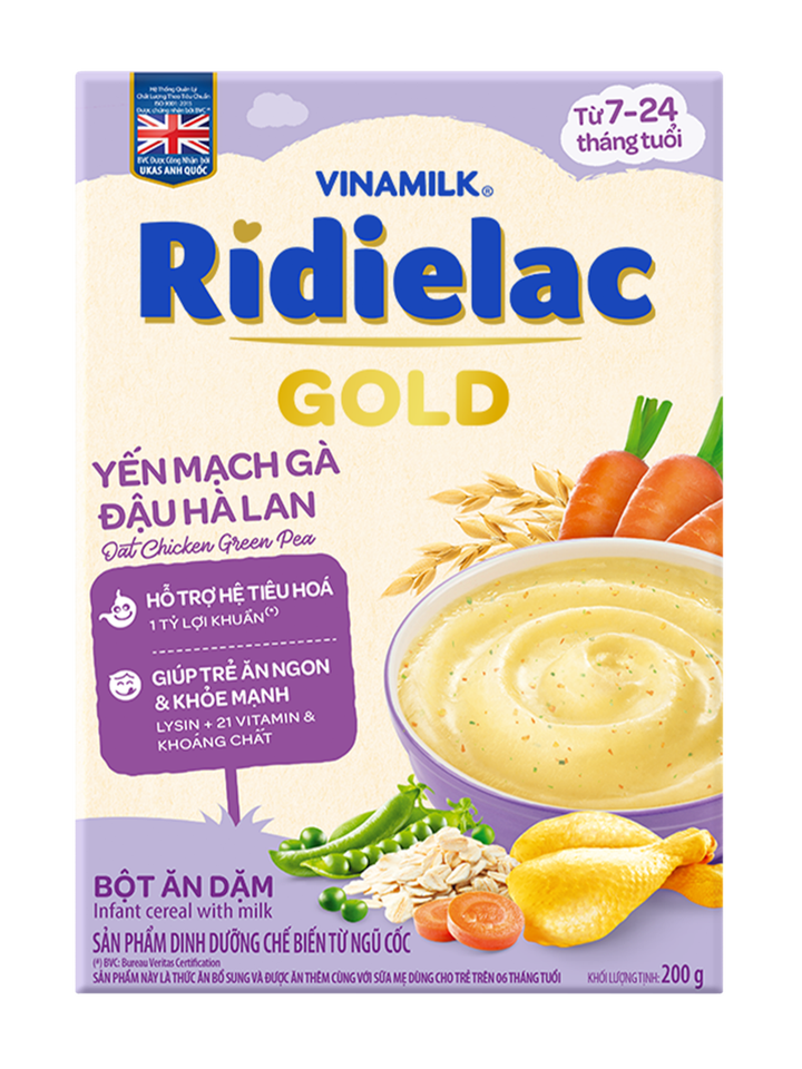 Vinamilk-ridielac Gold-ซีเรียลสำหรับทารก-อาหารเด็ก-ข้าวโอ๊ต, ไก่ & ถั่วเขียวรส-บรรจุ200กรัมต่อกระป๋อง X 48กล่อง