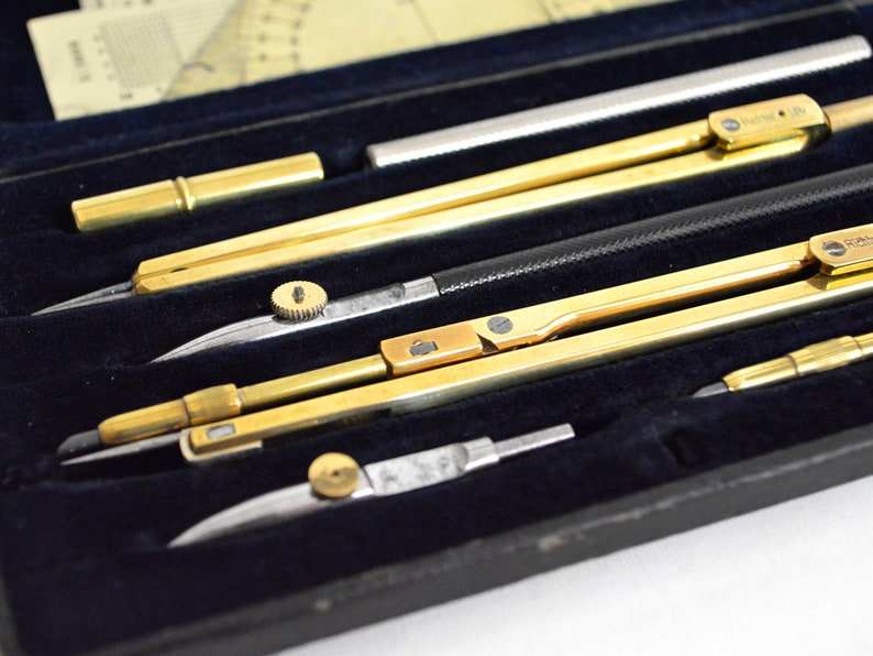 ชุดเข็มทิศทองคำวินเทจ 1 ชุด เข็มทิศริทเชอร์เยอรมัน ชุด 9 ชิ้น พร้อมซองหนัง เข็มทิศสีบรอนซ์ เครื่องมือแท้