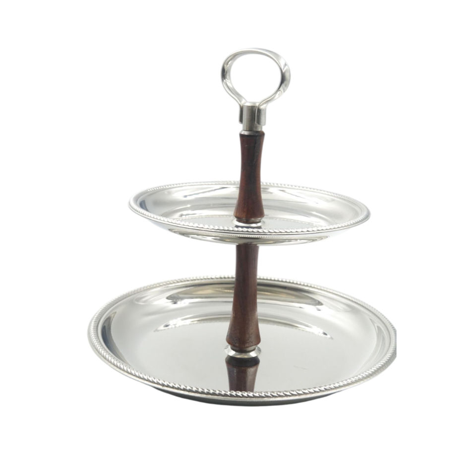 ชั้นวางเค้ก 2 ชั้น สไตล์วินเทจ ทำจากสแตนเลส พร้อมที่จับไม้สัก ดีไซน์กลางศตวรรษที่ทันสมัย ถาดเสิร์ฟขนมหวาน ราคาสมเหตุสมผล