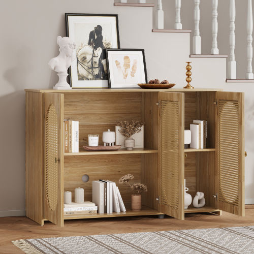Vintage 3-Door Sideboard Faux Rattan Doors Metal Handles Large Storage Antique for Living Room Hallway Decorative Cabinets Wood