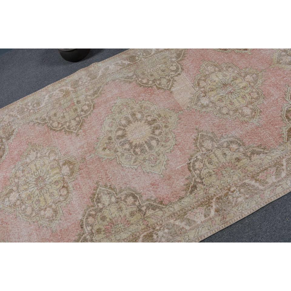 พรมตุรกีวินเทจขนาดใหญ่ 4.7 ฟุต x 12.4 ฟุต เป็นมิตรกับสิ่งแวดล้อม ขนปานกลาง ดีไซน์คลาสสิกสีชมพูเบจแบบแพทช์เวิร์ค ทำจากวัสดุขนสัตว์และยางพารา