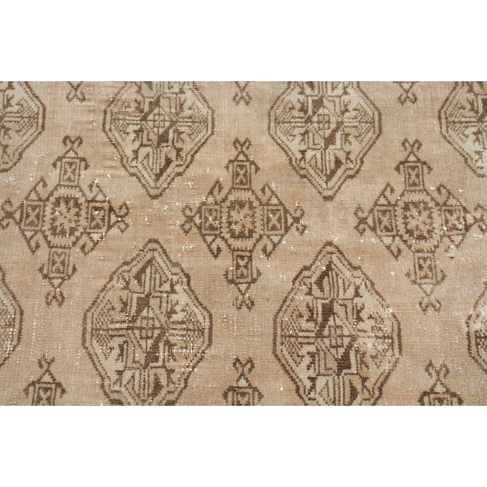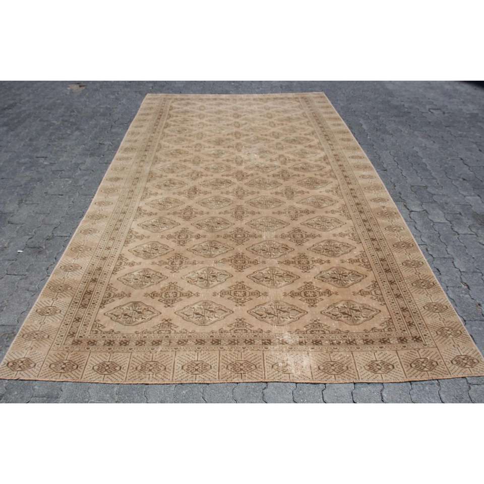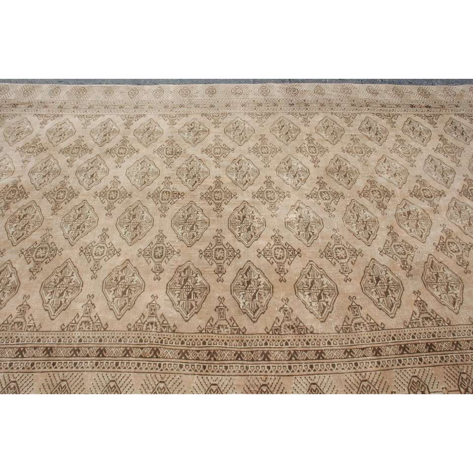 พรมตุรกีวินเทจขนาดใหญ่พิเศษ 6.4x11 ฟุต สีน้ำตาลเบจ ลายปะติดปะต่อ ทำจากขนสัตว์ เป็นมิตรต่อสิ่งแวดล้อม ด้านหลังเป็นยางลาเท็กซ์