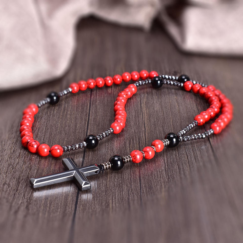 สร้อยคอโรซารีไม้สนแดงวินเทจขนาด 8 มม. พร้อมจี้กางเขนเฮมาไทต์สำหรับผู้ชายและผู้หญิง