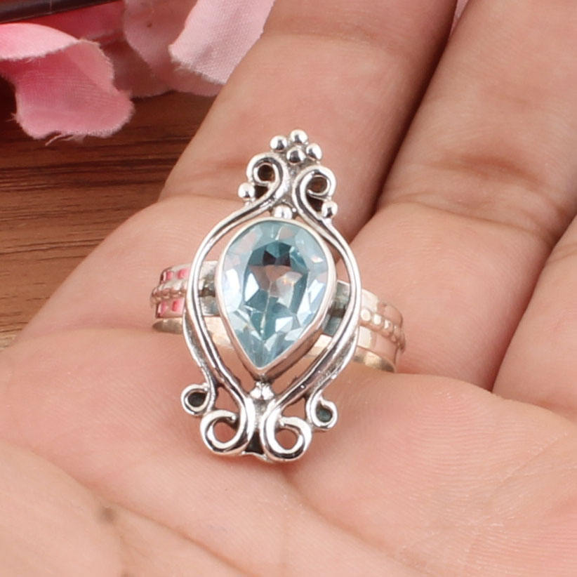 แหวนเงินแท้ 925 แบบวินเทจ ประดับพลอยบลูโทแพซ ฝังแบบกรอบ ลวดลายอาร์ตเดโค สไตล์ลอนดอน แหวนโบราณสำหรับผู้หญิง เหมาะสำหรับเป็นของขวัญวันครบรอบ