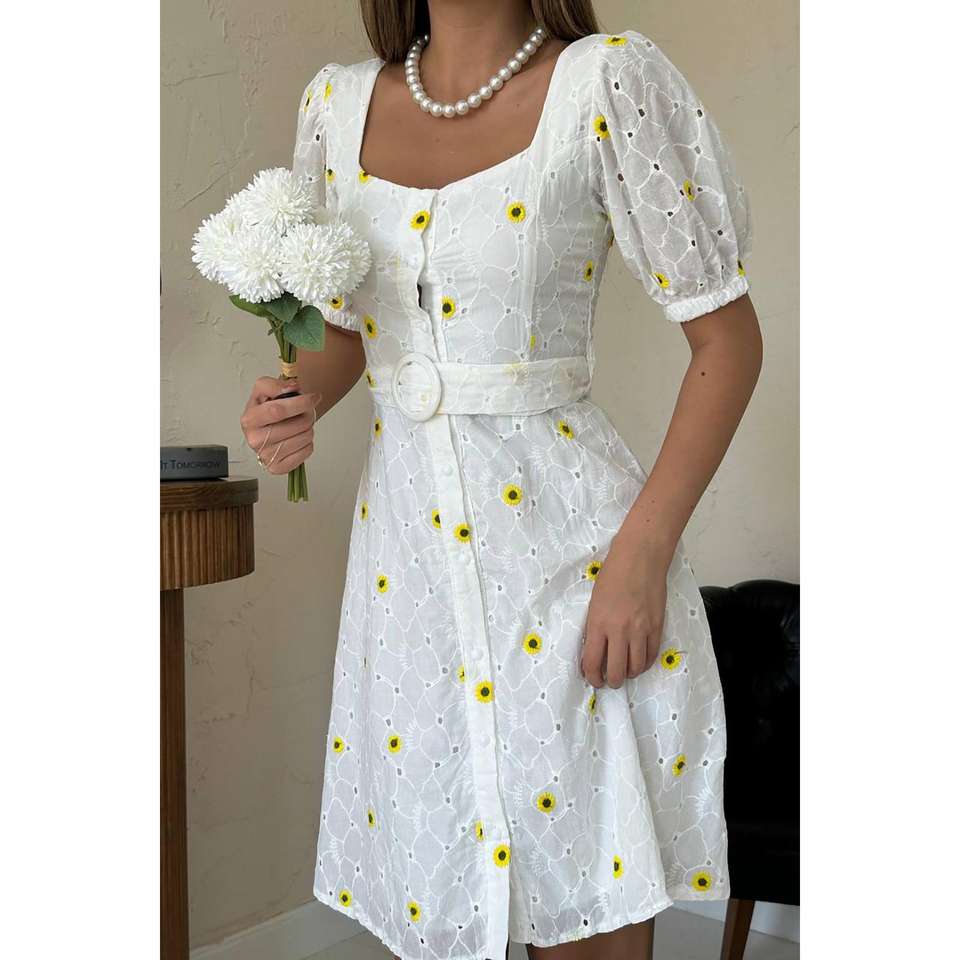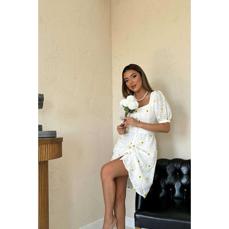 เดรสทรงเอวีวี คอเหลี่ยม แต่งลายปักสีเหลือง ผ้าทอ สวมใส่สบายๆ ทุกวัน เอวทรงธรรมชาติ