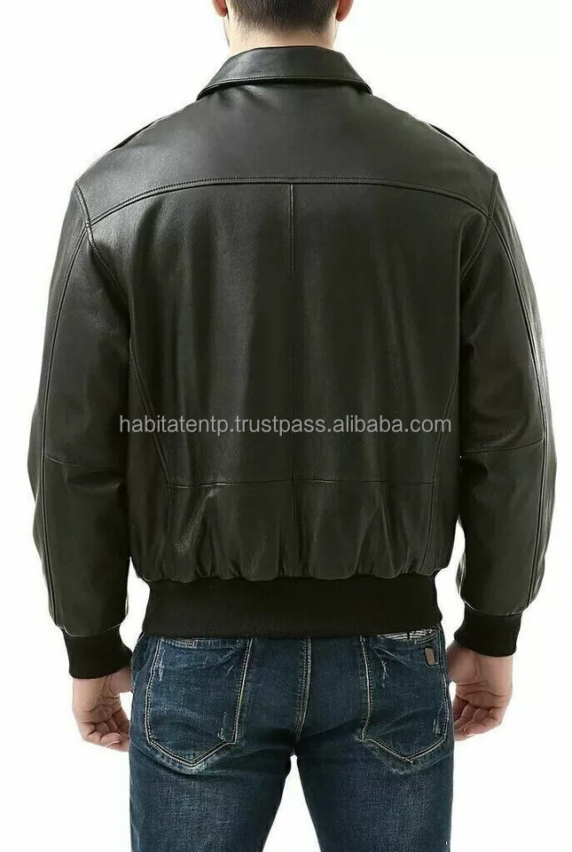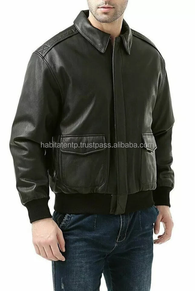 แจ็คเก็ตนักบินหนังแท้สไตล์วินเทจ A2 รุ่น Bomber สีดำ ทำจากหนังแกะแท้สำหรับผู้ชาย พร้อมโลโก้แบบกำหนดเอง