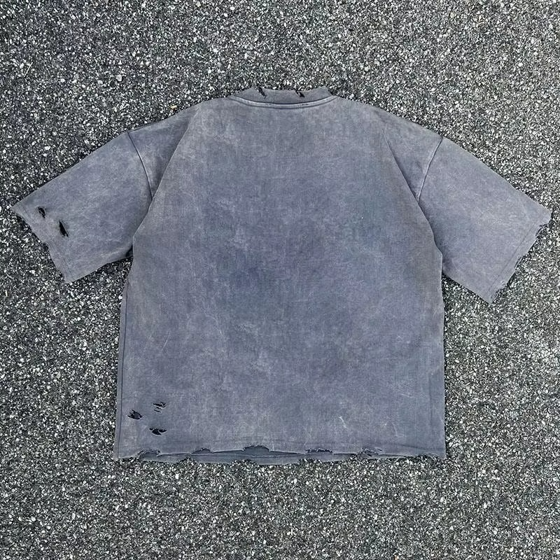 เสื้อยืดผู้ชายทรงปกติ ผ้าคอตตอนถัก 100% คุณภาพสูง ระบายอากาศได้ดี เป็นมิตรกับสิ่งแวดล้อม ลวดลายวินเทจฟอกสี พร้อมชายเสื้อแบบดิสเทรส
