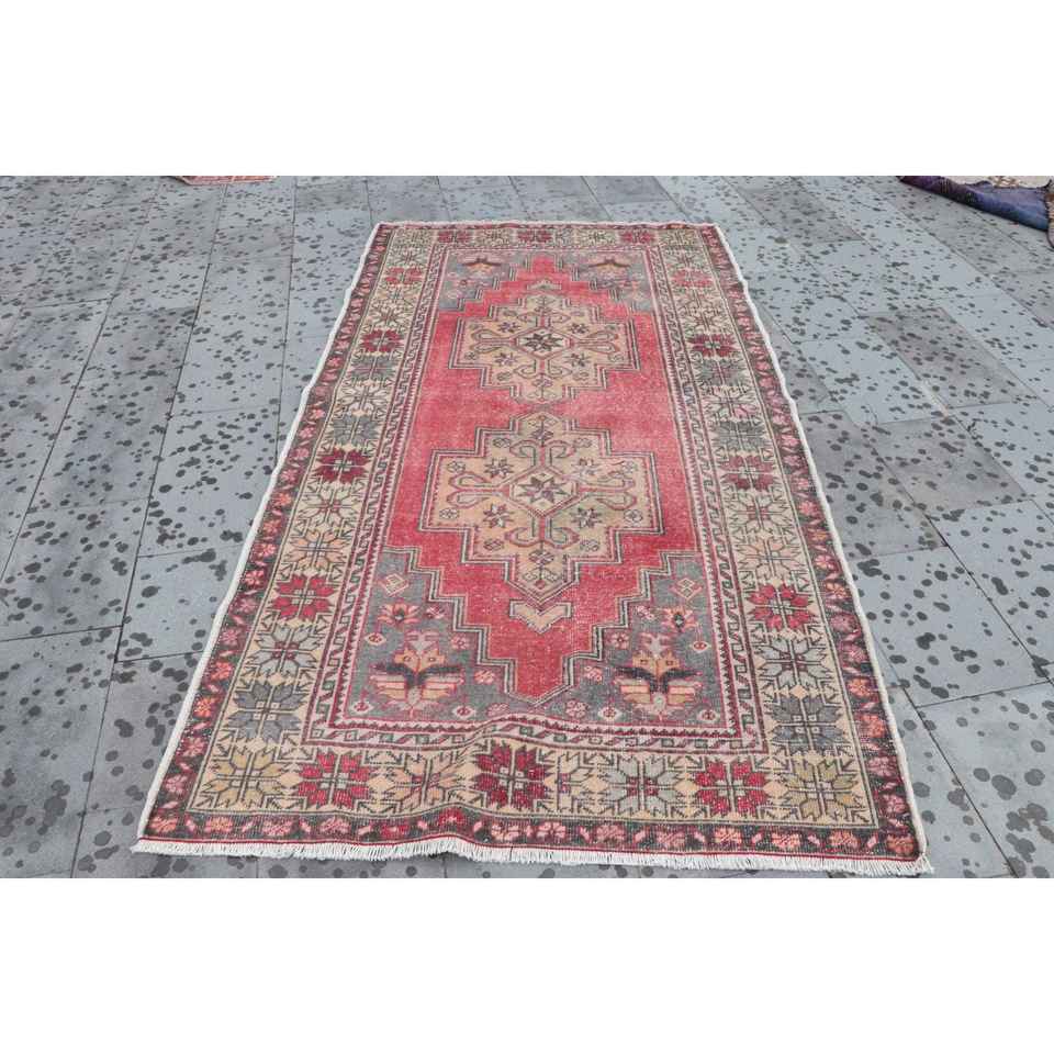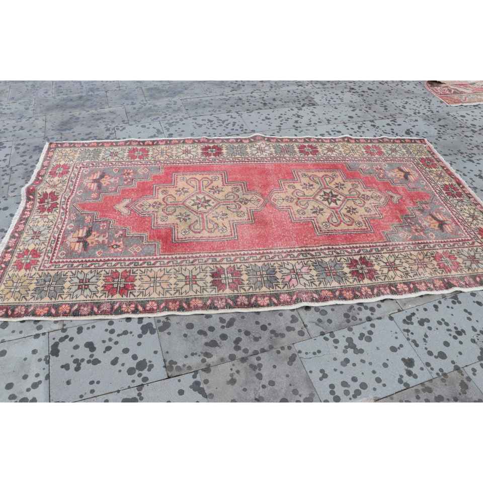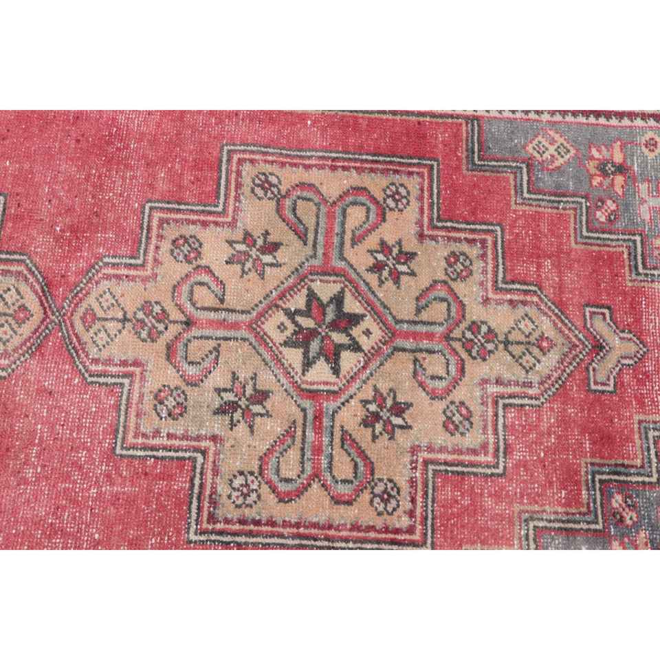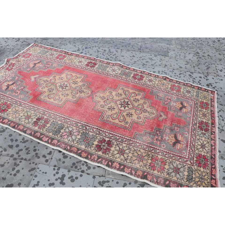 พรมวินเทจขนาด 4.4x8.2 ฟุต สีแดงเทา ลายจุด ทำจากขนสัตว์