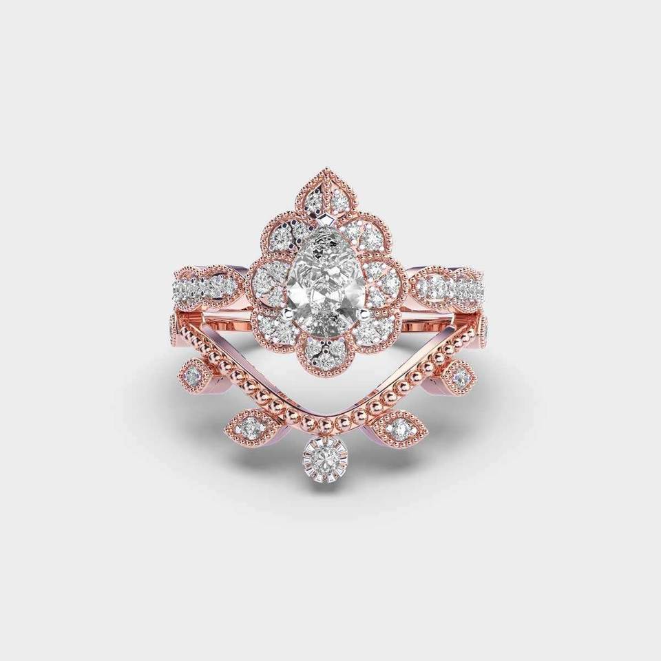 วินเทจอาร์ตเดคโคลูกแพร์ตัดในห้องปฏิบัติการแหวนหมั้นเพชรชุดมิลเกรนเบเซลแหวนแต่งงานพร้อมเครื่องประดับชุบโรเดียม