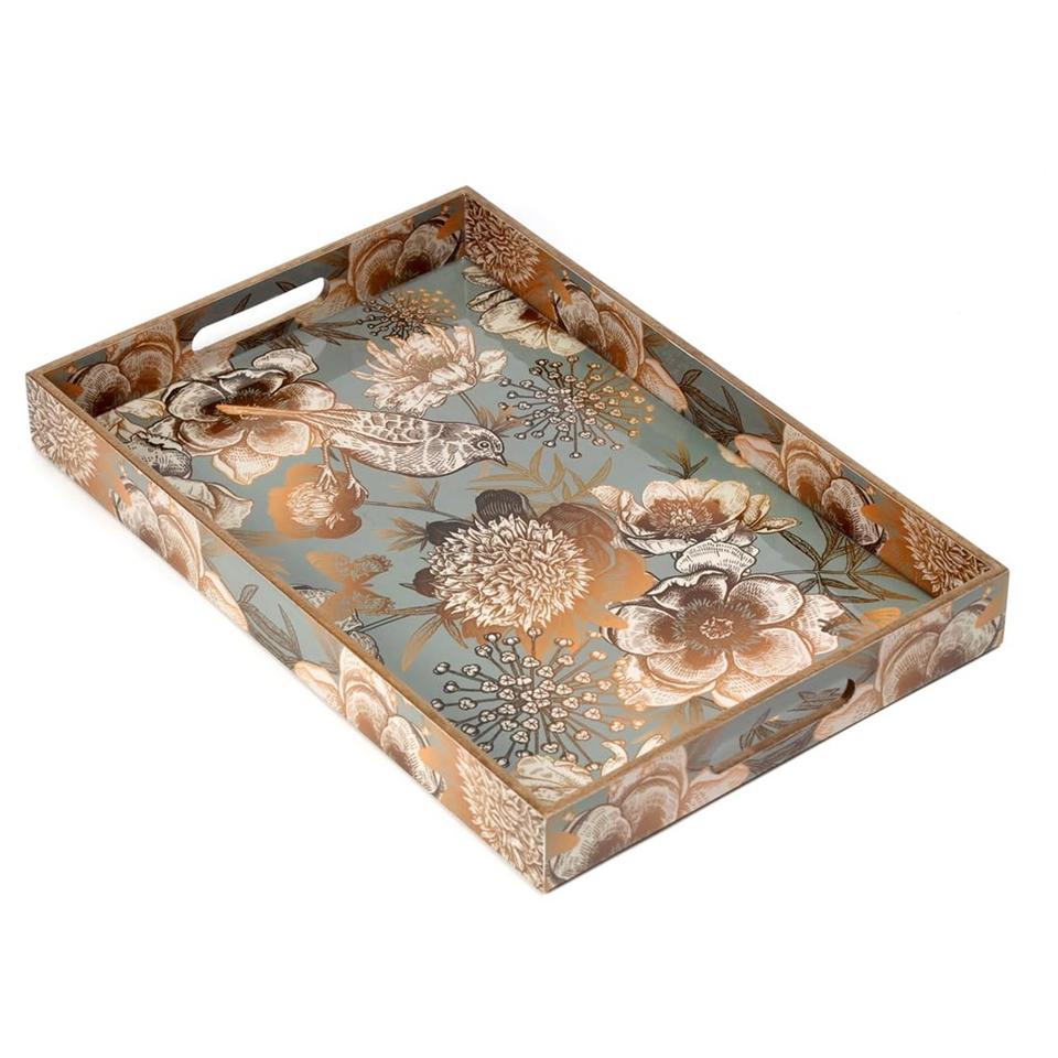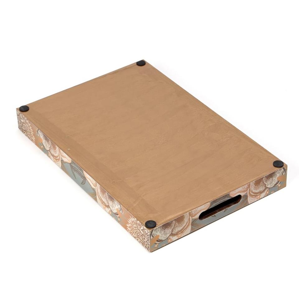 ถาดไม้สี่เหลี่ยมพิมพ์ลายดอกไม้สีทองและลายนกสไตล์วินเทจ พร้อมหูจับ สำหรับขายส่งและสั่งซื้อจำนวนมาก