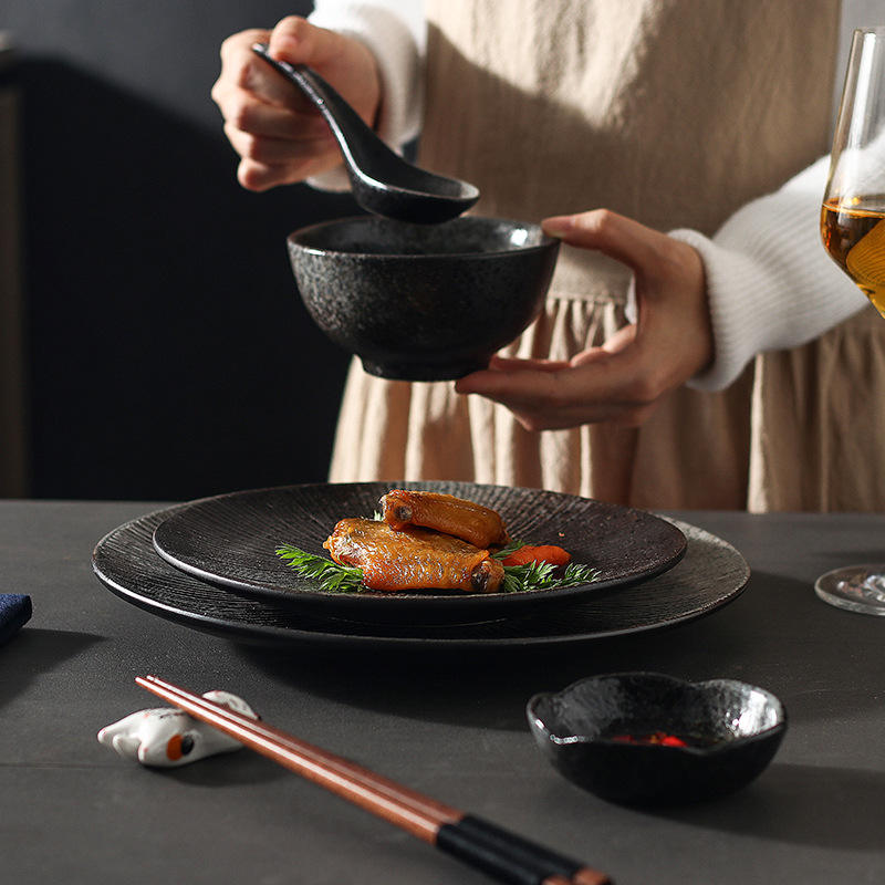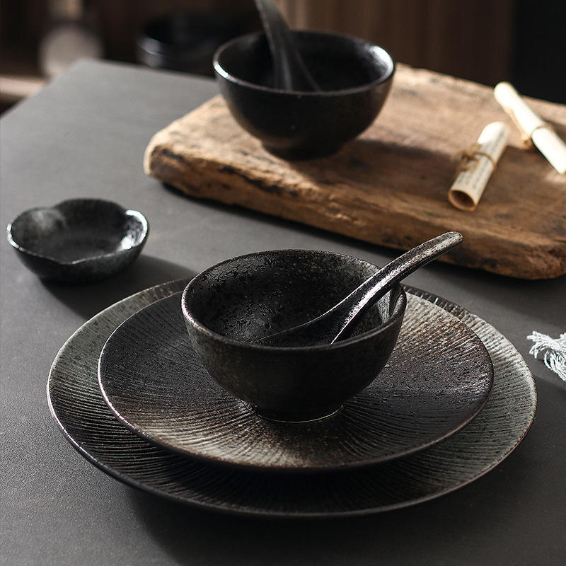 ชุดภาชนะอาหารจีนลายกระดูกเคลือบสีดำด้านเป็นมิตรต่อสิ่งแวดล้อมแนววินเทจพร้อมแผ่นเคลือบปฏิกิริยาสำหรับร้านอาหาร