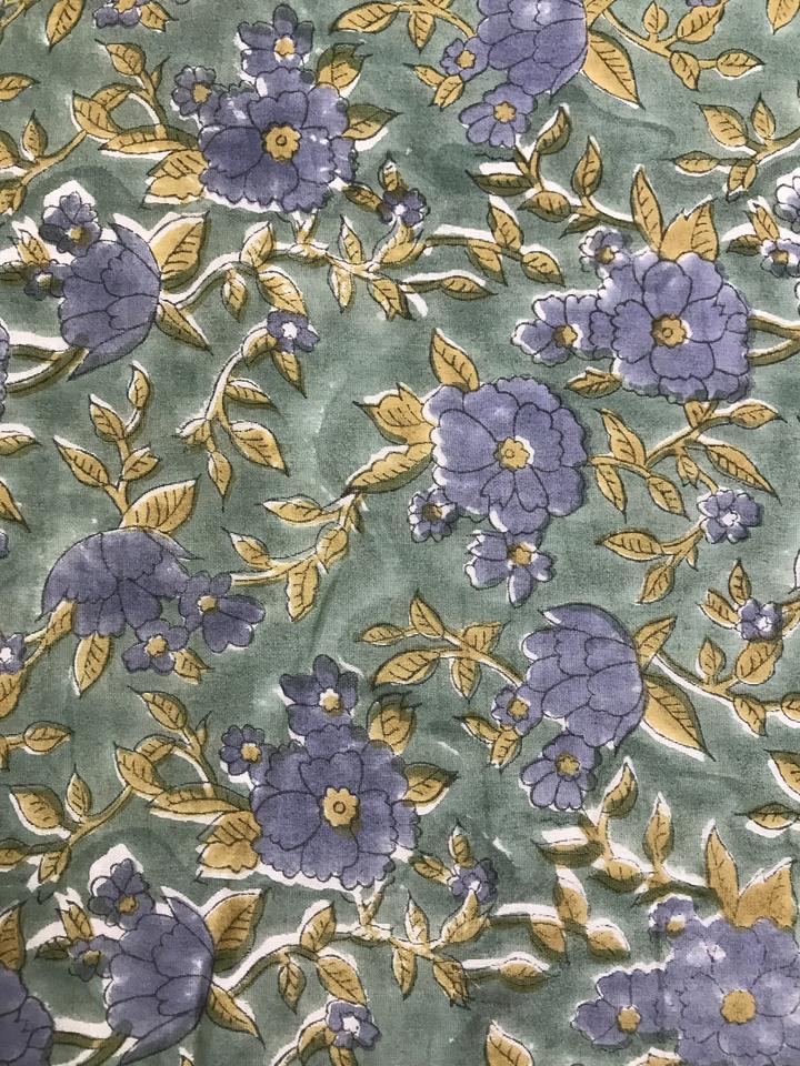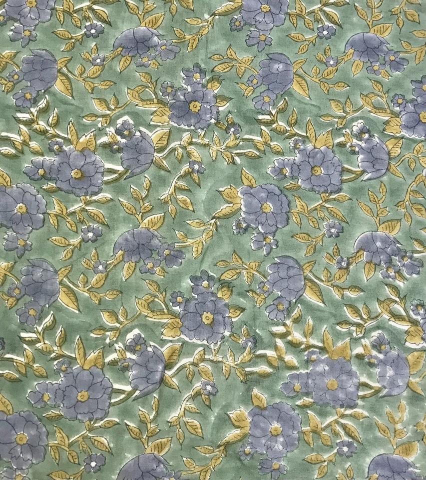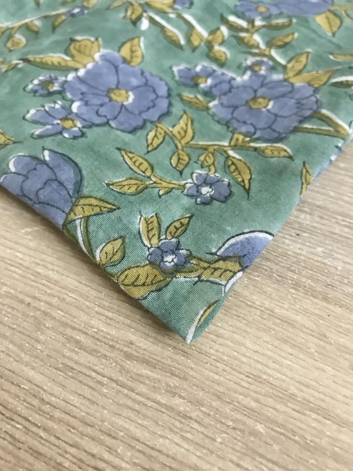 ผ้าพิมพ์ลายดอกไม้สีน้ำเงินวินเทจบนพื้นสีเขียว ลายพิมพ์ด้วยมือ สไตล์พฤกษศาสตร์แบบอินโด-ยุโรป