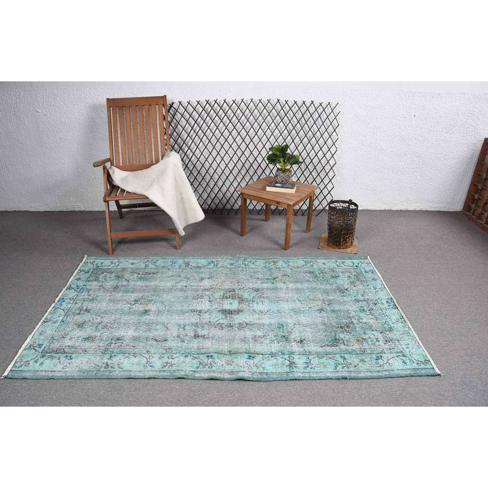 Vintage Blue Turkish Wool Rug 3.9ft X 6.8ft Flat Weave Patchwork Pattern Living Room Carpet with Latex Backing for Decorations