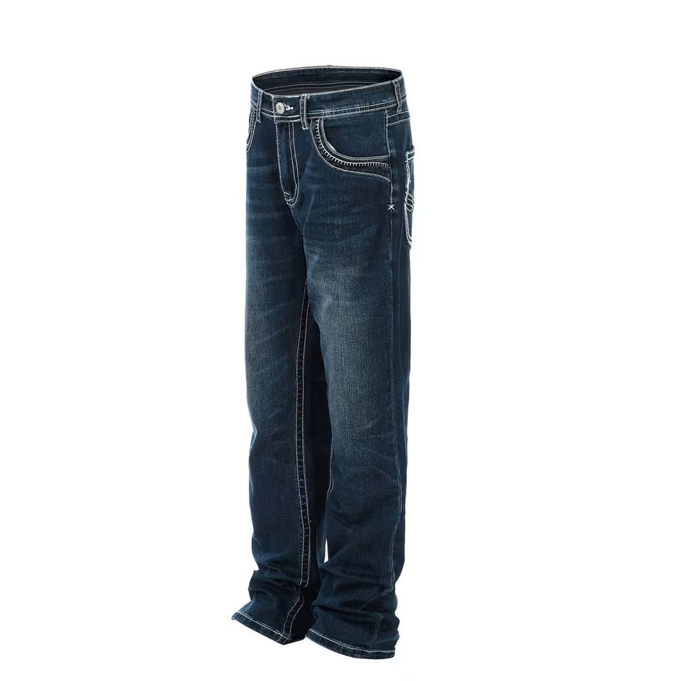 กางเกงยีนส์ทรงบานาน่าสีน้ำเงินวินเทจสำหรับผู้ชาย คุณภาพสูง ทรงสกิมิทาร์ ตะเข็บโค้ง ระบายอากาศได้ดี เหมาะสำหรับการออกกำลังกาย