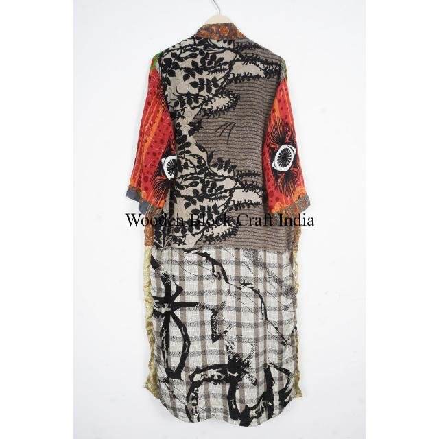 ชุดกิโมโนผ้าไหมลายดอกไม้สไตล์โบฮีเมียนวินเทจสำหรับผู้หญิง ชุดนอน/ชุดคลุมอาบน้ำ/ชุดคลุมยาวแบบผูกเชือก คอวี ลายปะติด สำหรับฤดูร้อน