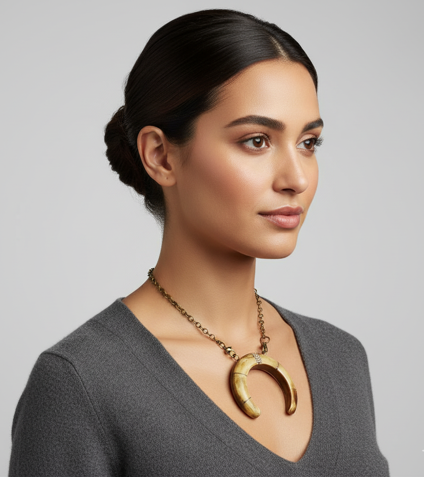 สร้อยคอจี้รูปพระจันทร์เสี้ยวทำจากเขาสัตว์โบราณ พร้อมสายทองเหลืองโบราณ - เครื่องประดับพระจันทร์เขาคู่สไตล์โบฮีเมียน - จี้ทำจากกระดูก