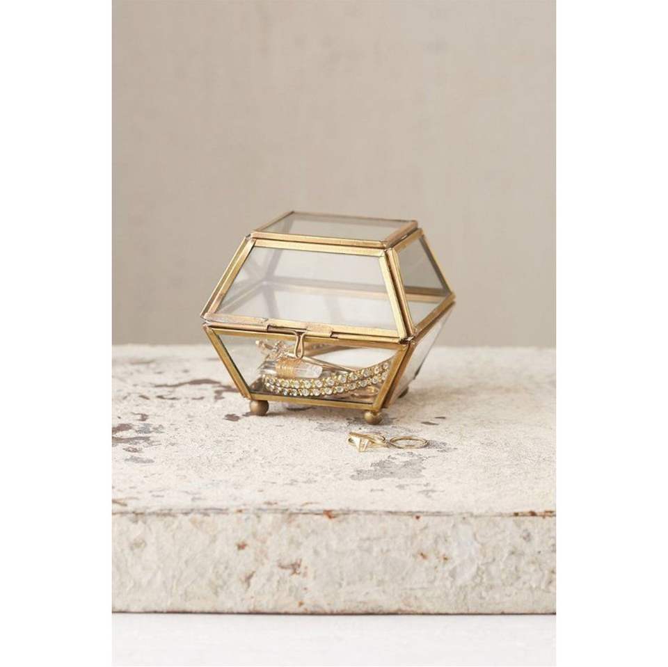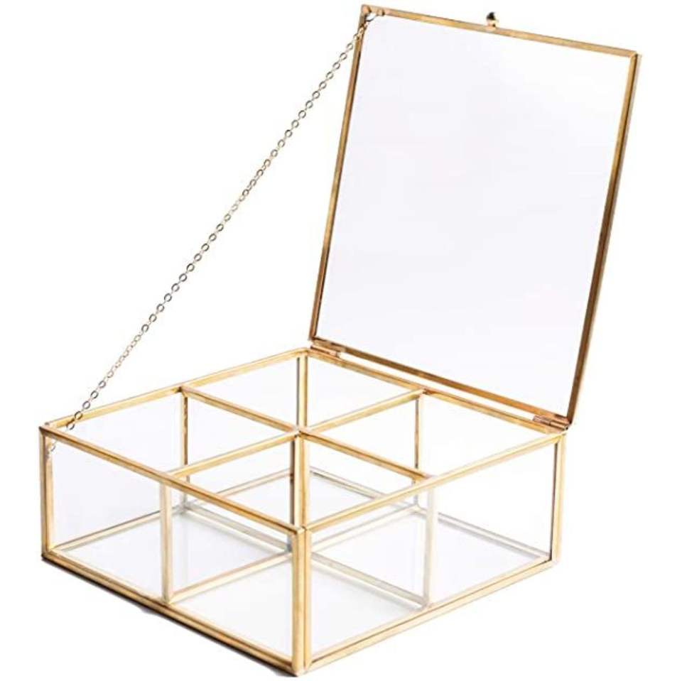 กล่องแก้วขอบทองเหลืองโบราณ ฝาปิดแบบมีบานพับ กล่องเก็บของทรงหีบสมบัติ ภาชนะแก้วสำหรับจัดแสดงต้นไม้ ใช้เก็บเครื่องประดับและเป็นของตกแต่งกลางโต๊ะ