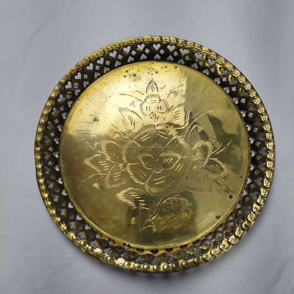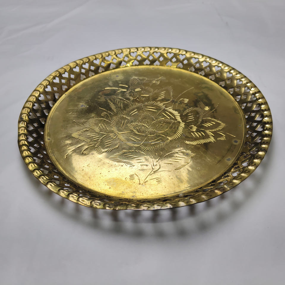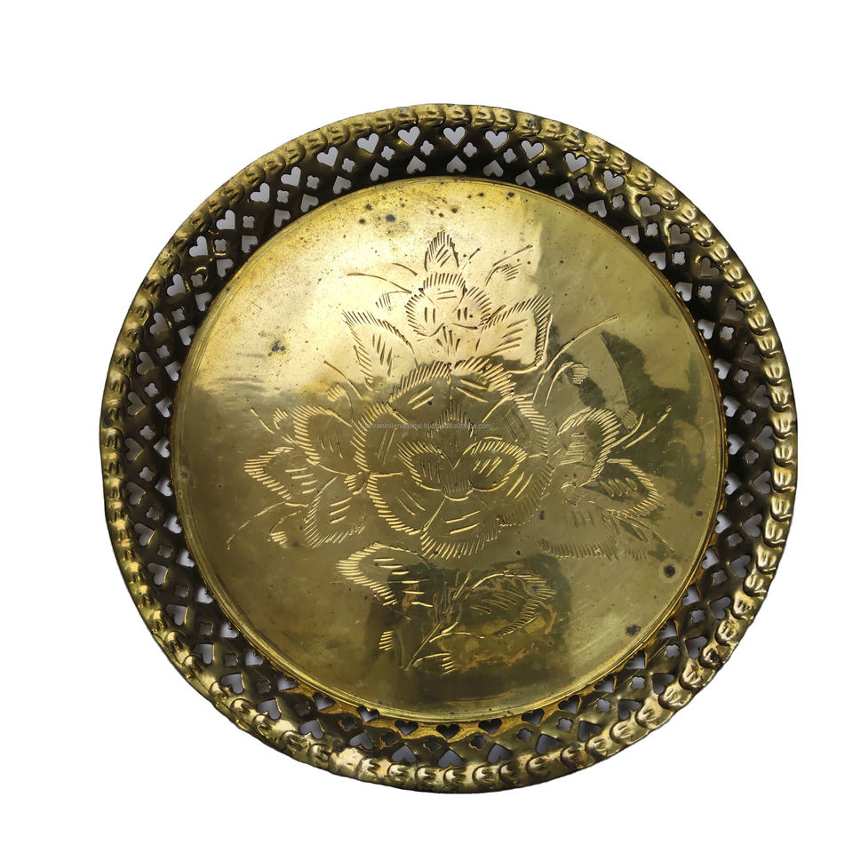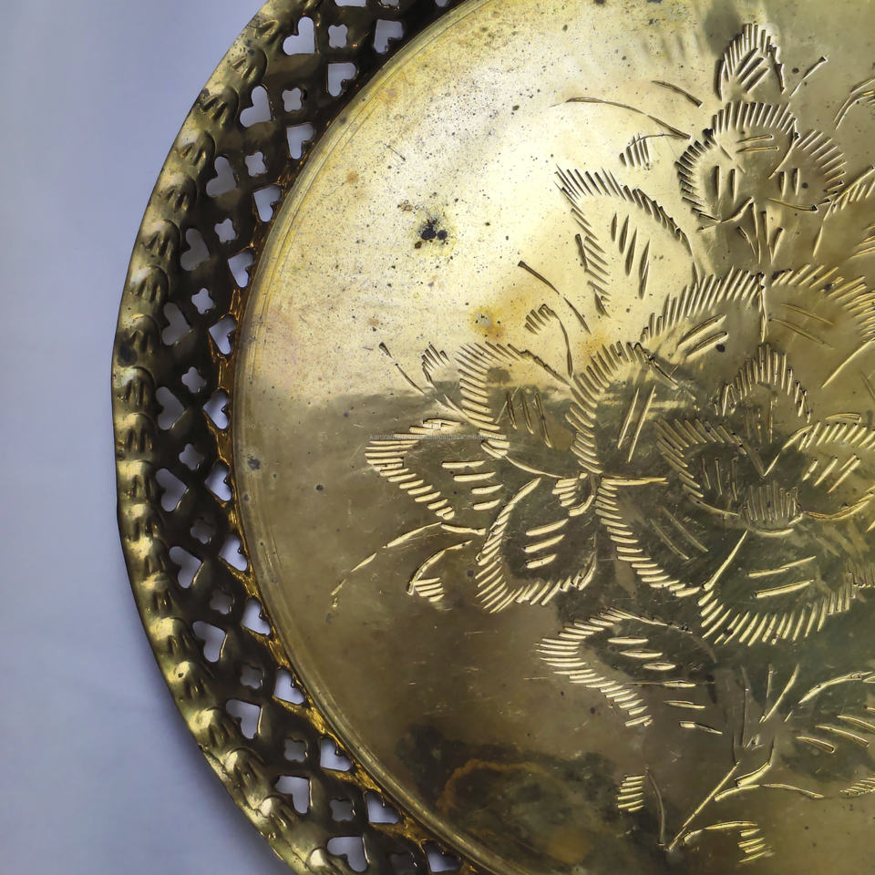 ถาดเสิร์ฟทรงกลมทองเหลืองวินเทจ พร้อมลวดลายดอกไม้สลักอย่างประณีต และขอบรูปหัวใจแบบเจาะรู – สินค้าสีทองโบราณ