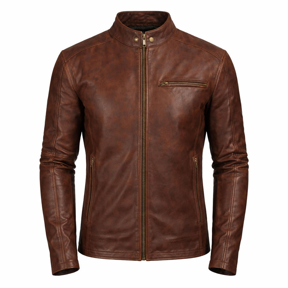 Vintage Brown Genuine Leather Jacket Men Slim Fit Stand Collar Biker Motorcycle Style Casual Zip Up Coat OEM Factory