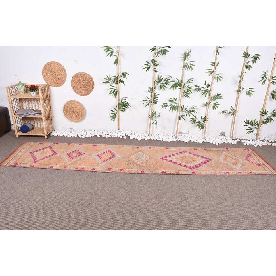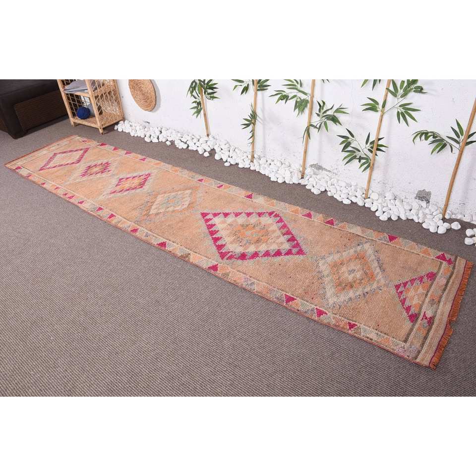พรมขนสัตว์สีชมพูวินเทจลายเรขาคณิต2.5x11.1ฟุตลายแอบสแตรกต์แบบปะต่อสำหรับวัยรุ่นบ้านห้องนั่งเล่น