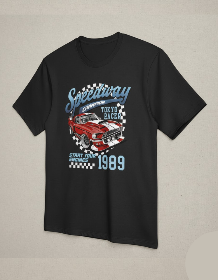 เสื้อยืดลายกราฟิกวินเทจรถแข่ง Speedway Champion Tokyo Racer สำหรับผู้ชาย ผ้าฝ้าย สตรีทแวร์ พิมพ์ลายรถมัสเซิลคาร์