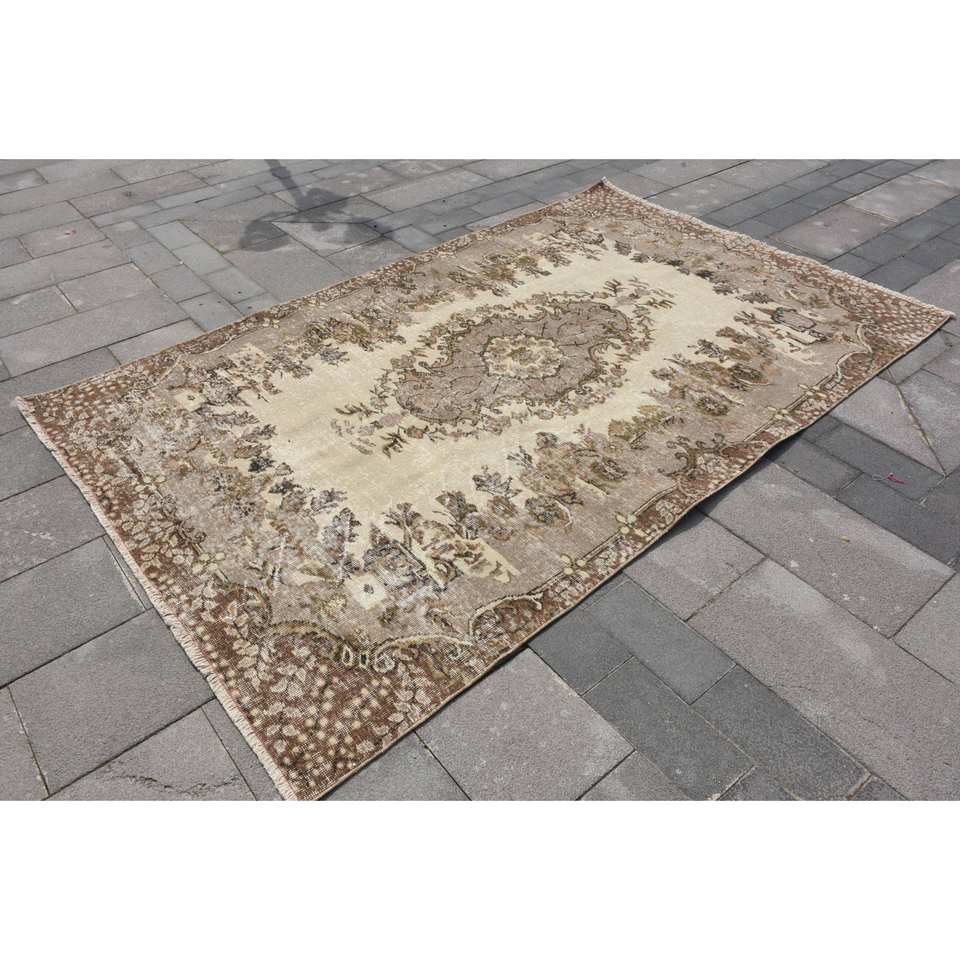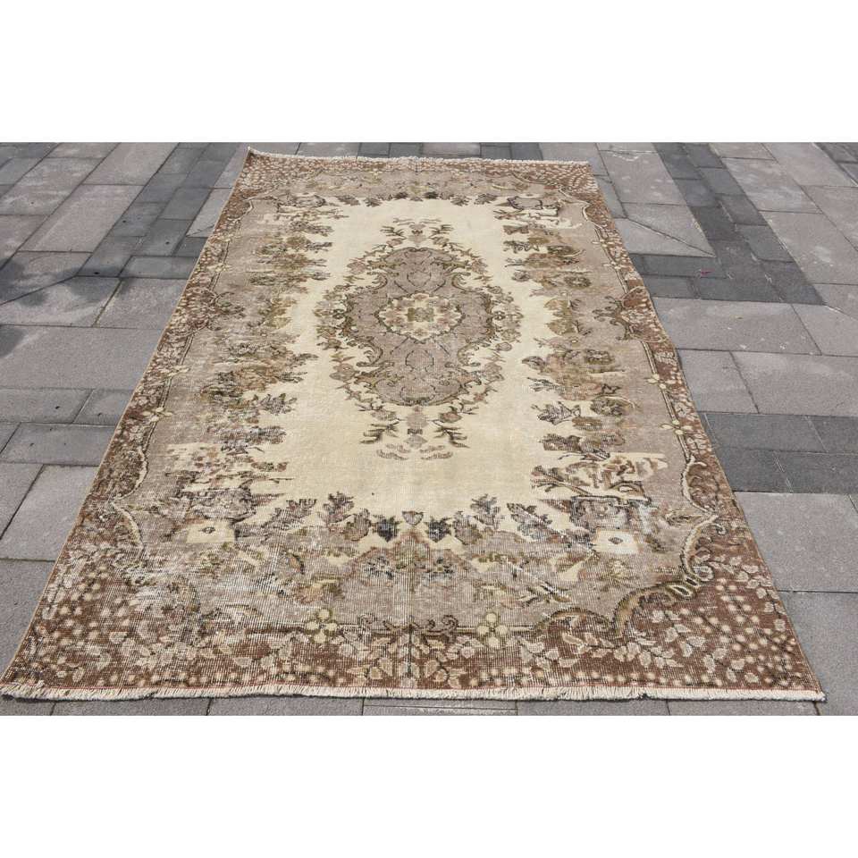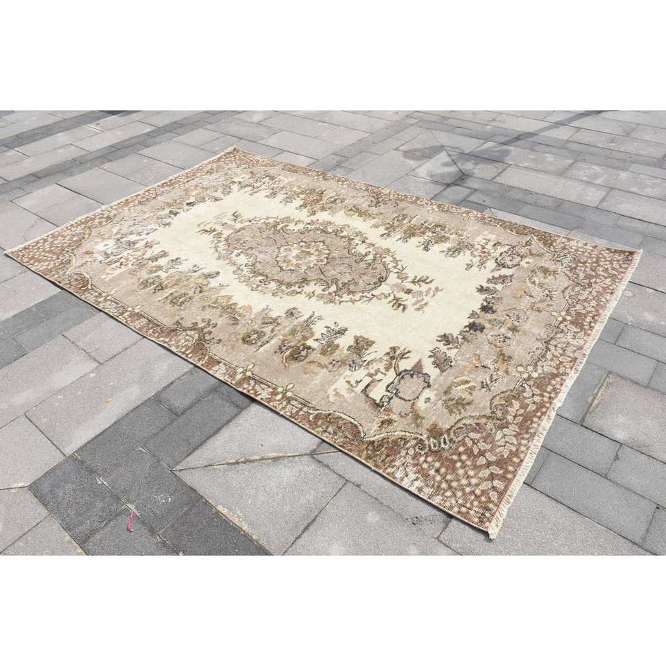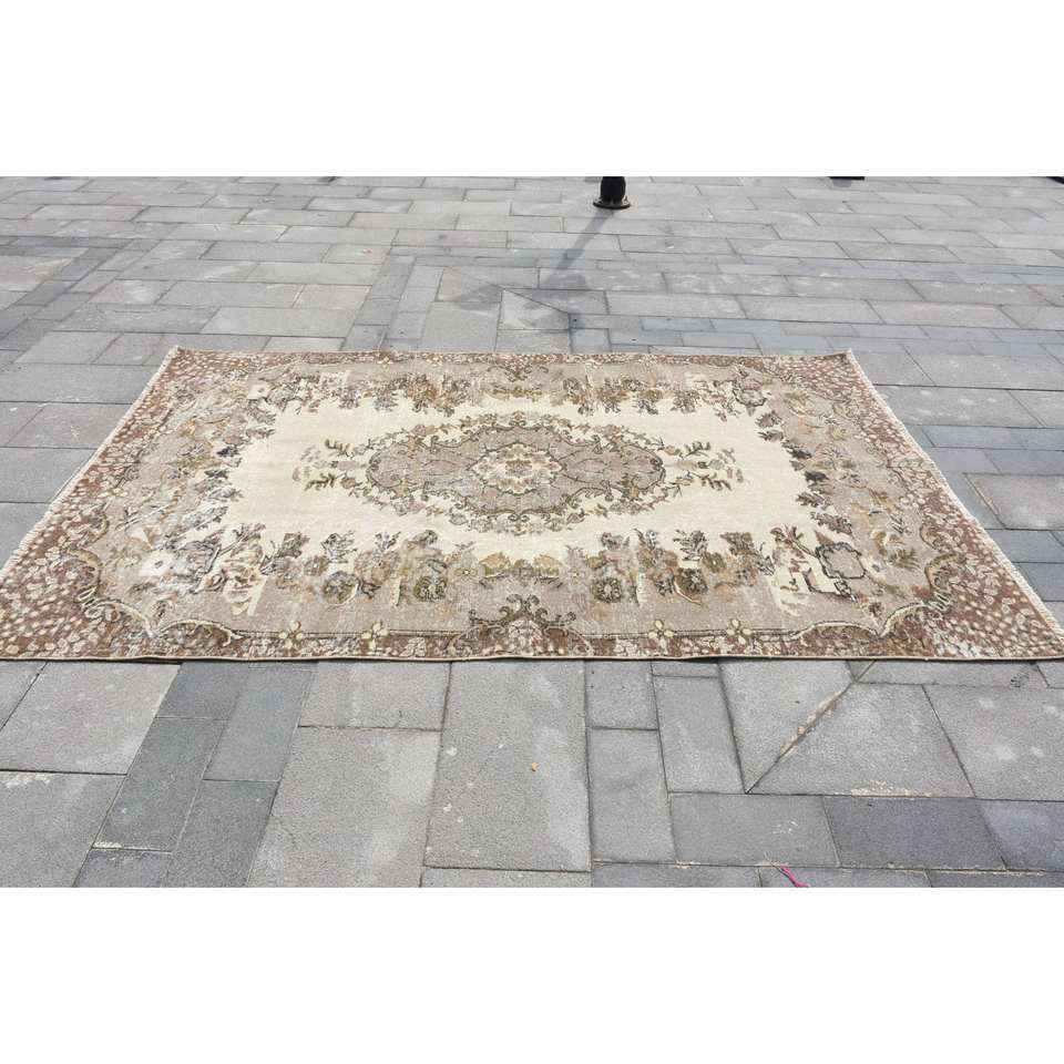 พรมตุรกีวินเทจขนสัตว์แฮนด์เมดขนาด5.5x8.5ฟุตมีลวดลายเย็บปะติดด้านหลังสำหรับข้างเตียง